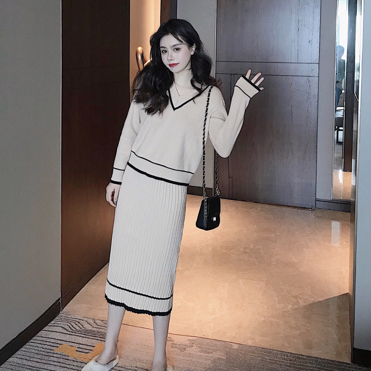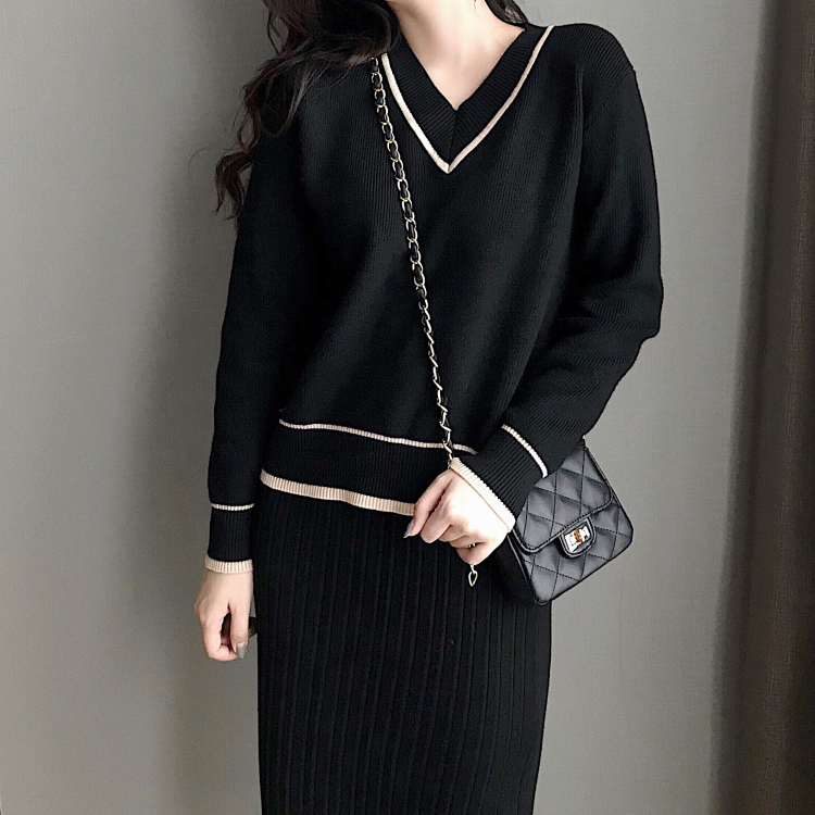 復古韓國chic風小香風寬松V領針織百褶連衣裙氣質套裝時尚兩件套