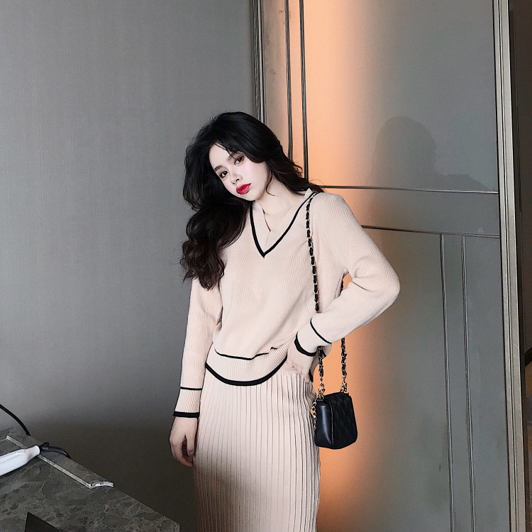 / 復古韓國chic風小香風寬松V領針織百褶連衣裙氣質套裝時尚兩件套