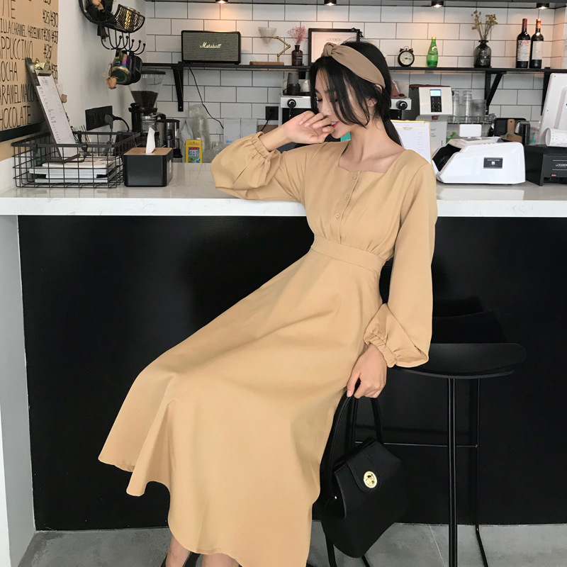 / 2018新款韓范復古百搭時尚中長款收腰長袖連衣裙方領燈籠袖A字裙