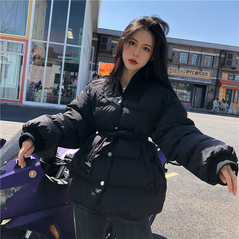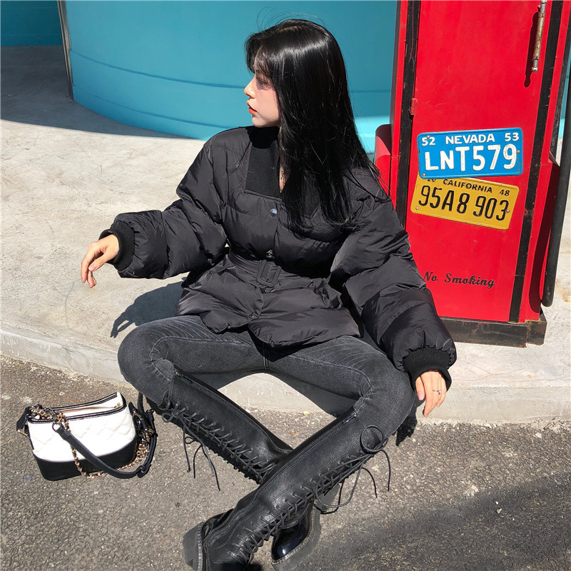 / 2018冬季chic綁帶收腰顯瘦V領百搭復古加厚保暖棉服女面包服外套