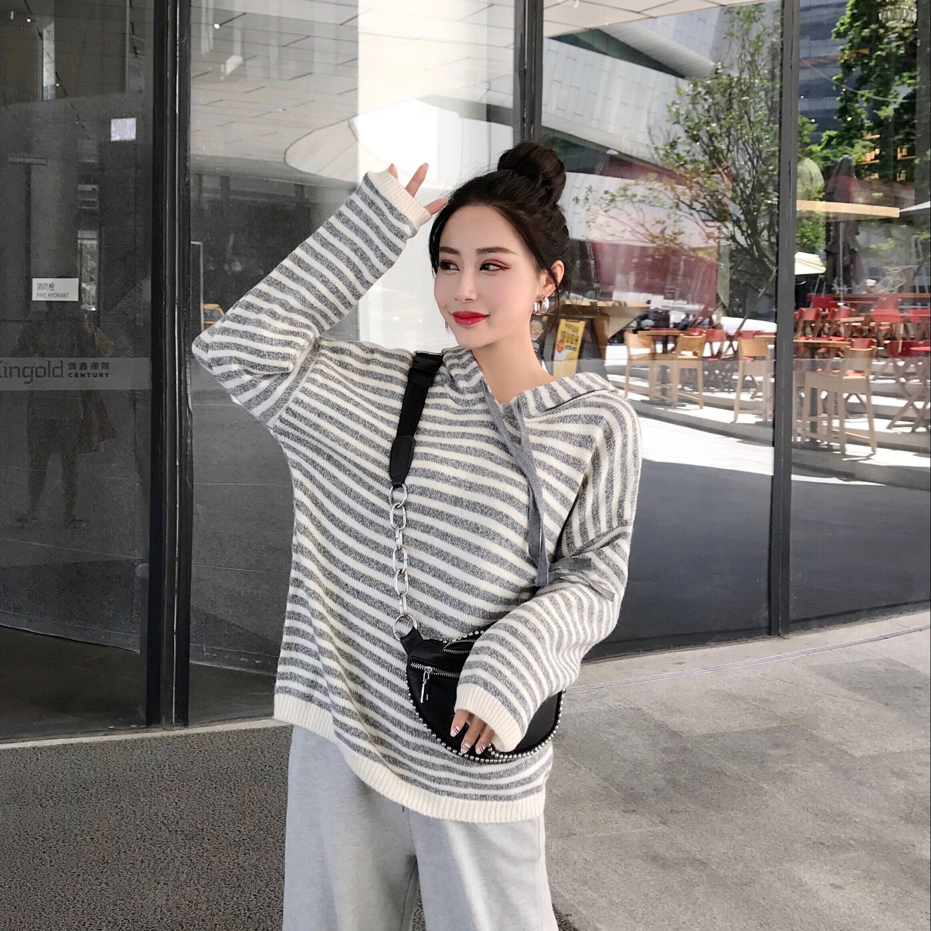復古慵懶風毛衣外套女韓版2018新款寬松連帽套頭加厚條紋針織衫女