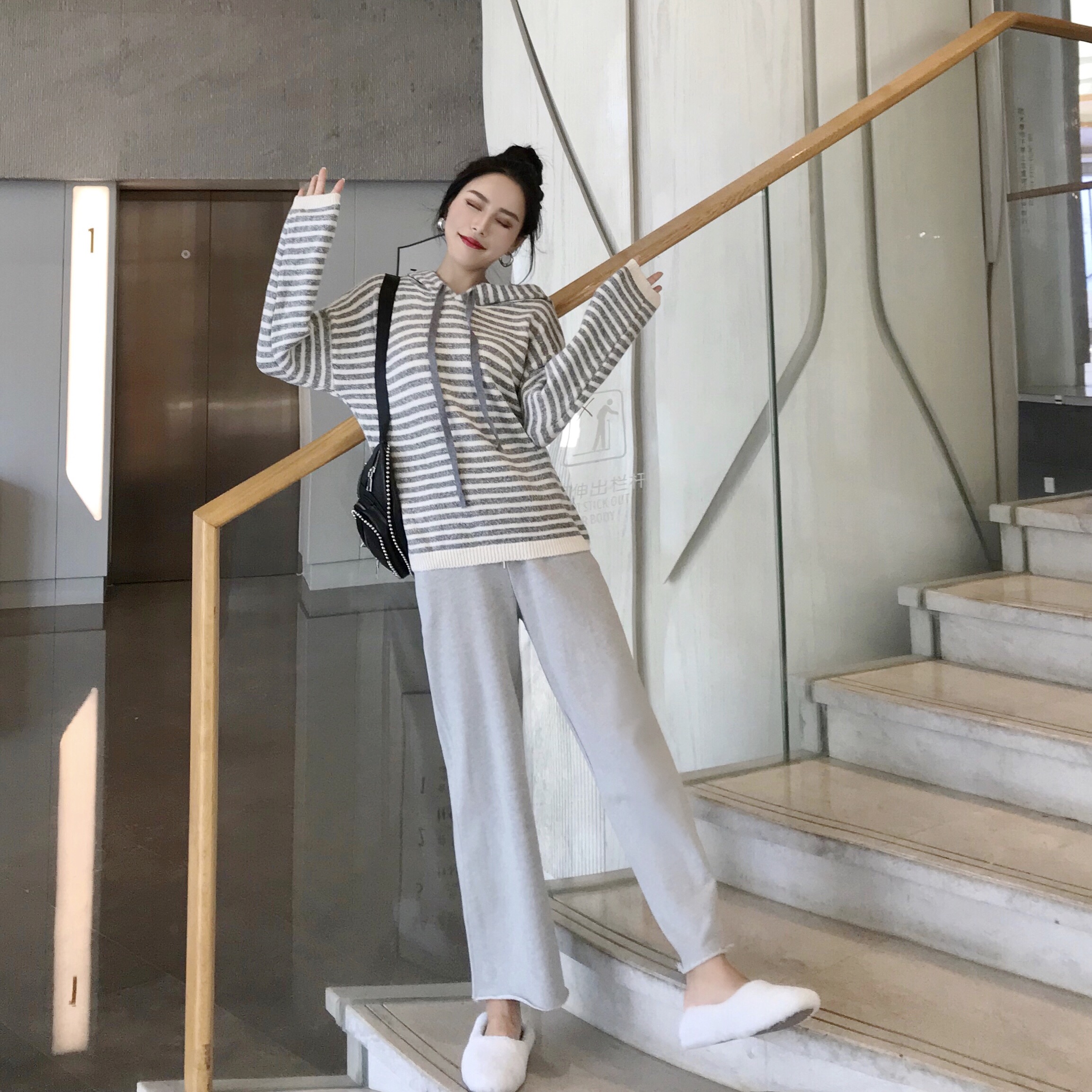 秋裝女2018新款軟糯連帽條紋毛衣女+慵懶風舒適闊腿褲(加厚版)