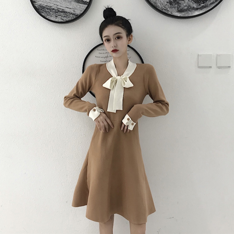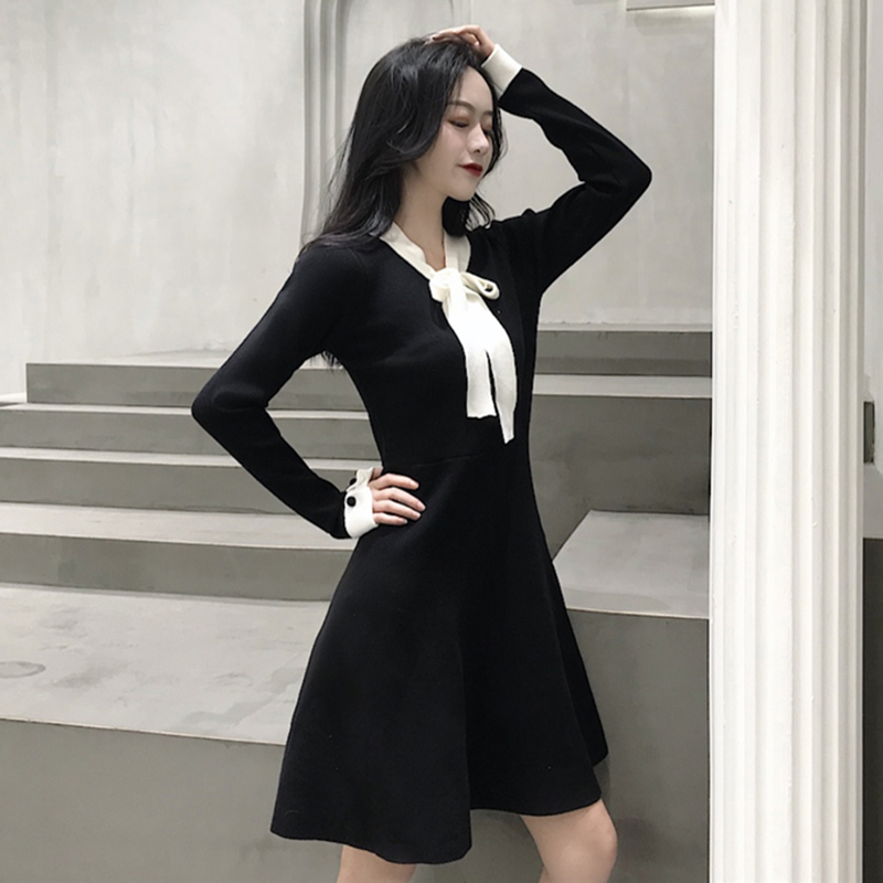 / 港味chic綁帶蝴蝶結裙子女秋冬裝2018新款氣質顯瘦針織A字連衣裙