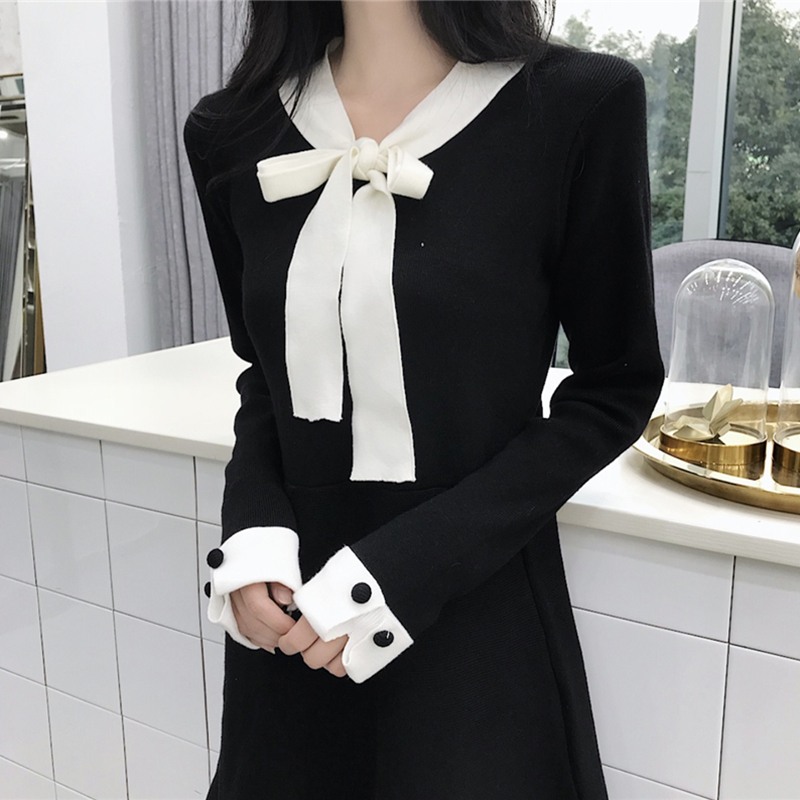 港味chic綁帶蝴蝶結裙子女秋冬裝2018新款氣質顯瘦針織A字連衣裙