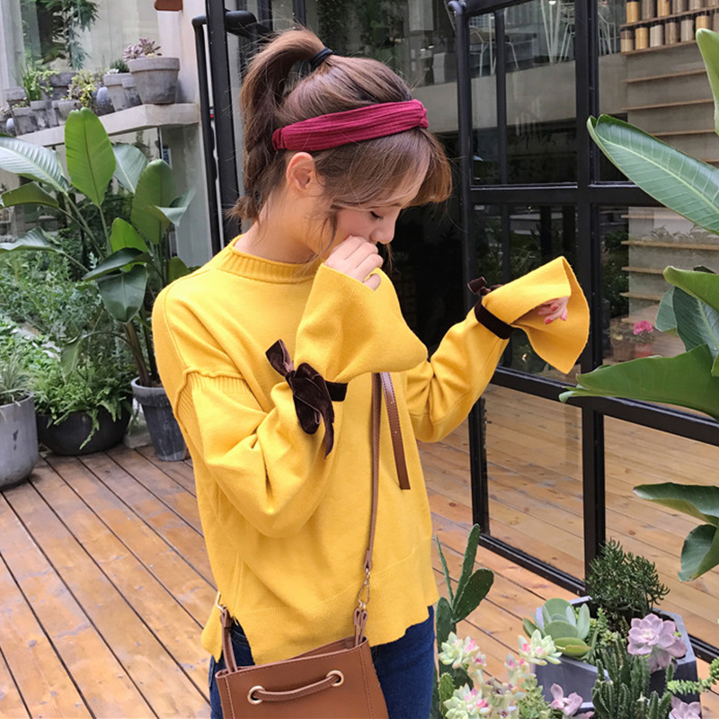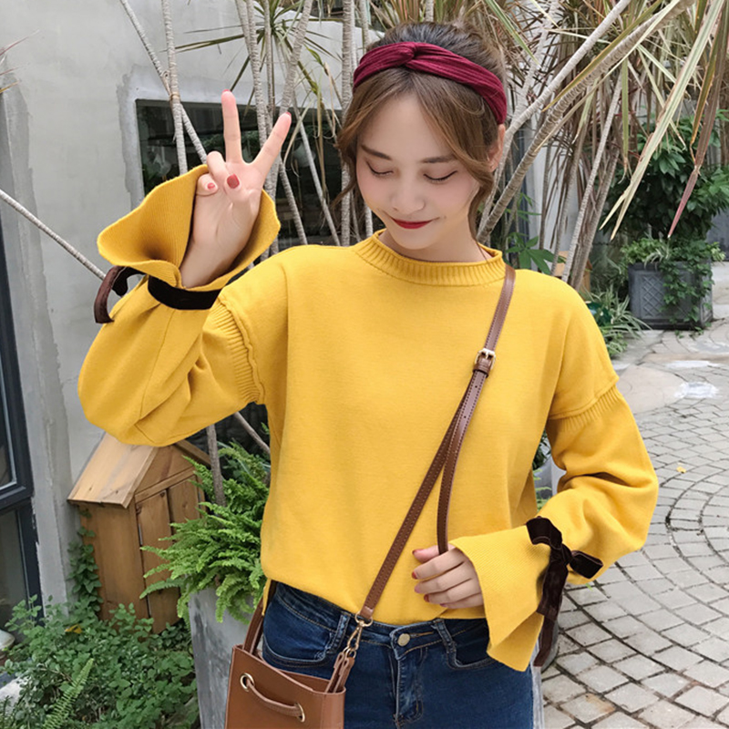慵懶風毛衣秋裝女2018新款小清新系帶荷葉長袖針織衫寬松圓領上衣