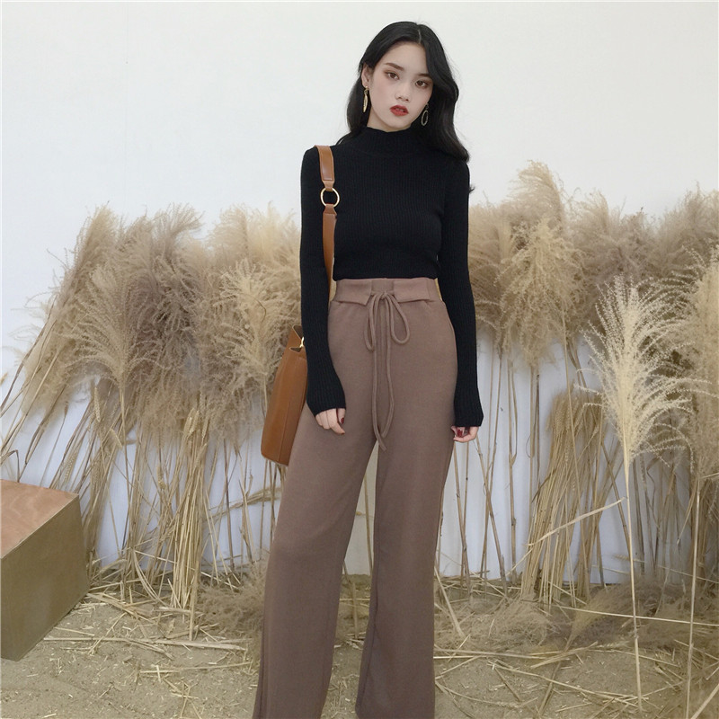 / 港味復古風2018秋裝新款修身顯瘦高腰系帶針織直筒長褲百搭闊腿褲