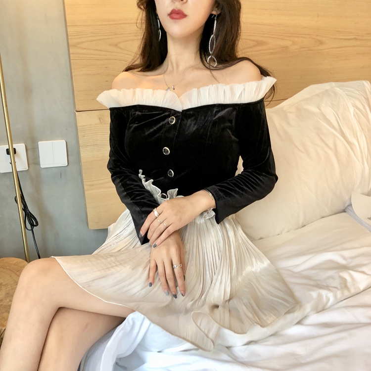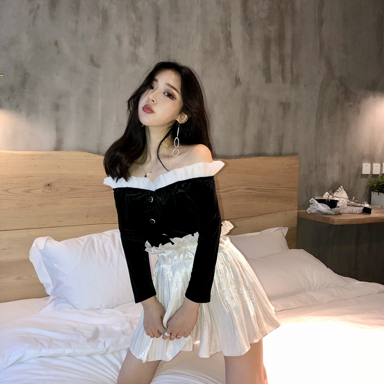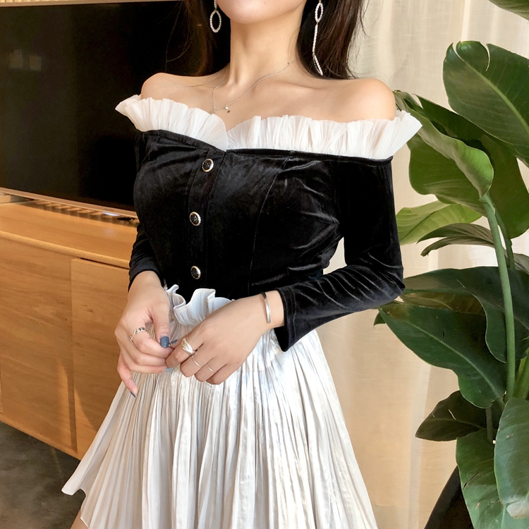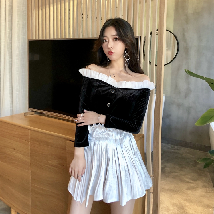 / 2018新款復古一字肩領修身絲絨褶皺仙氣蕾絲衫小心機打底衫T恤女