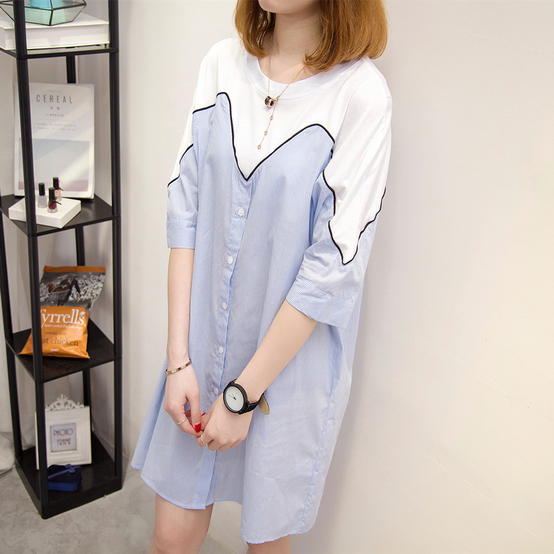 中長款襯衫女韓范短袖寬松百搭學生上衣夏裝新款潮豎條紋襯衣
