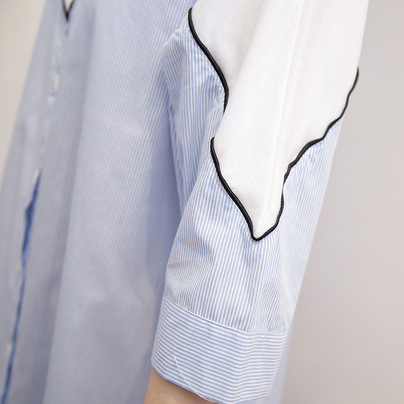 / 中長款襯衫女韓范短袖寬松百搭學生上衣夏裝新款潮豎條紋襯衣