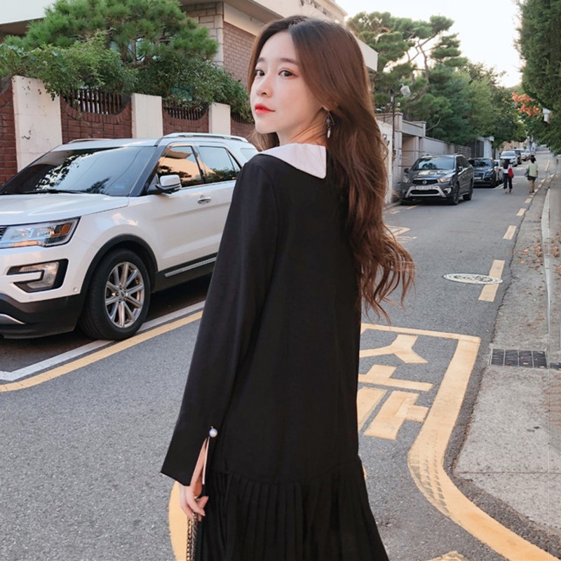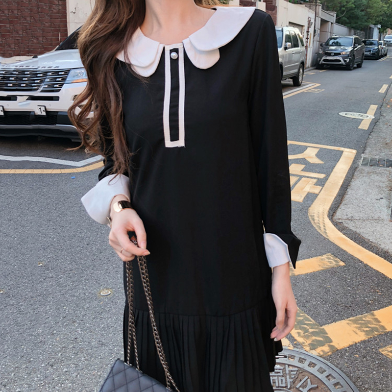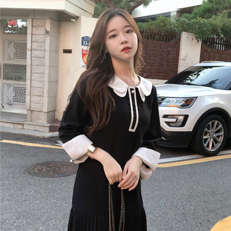 / 女秋裝新款韓版氣質娃娃領珍珠扣百褶連衣裙顯瘦黑色a字中長裙子