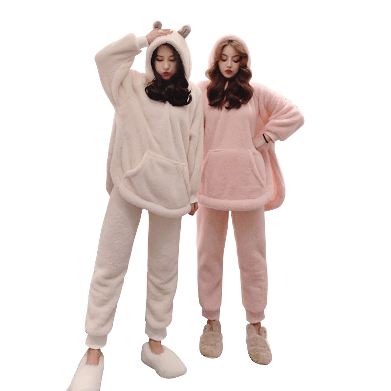 2018新款長袖睡衣女甜美可愛熊耳朵加厚保暖韓版清新家居服套裝女