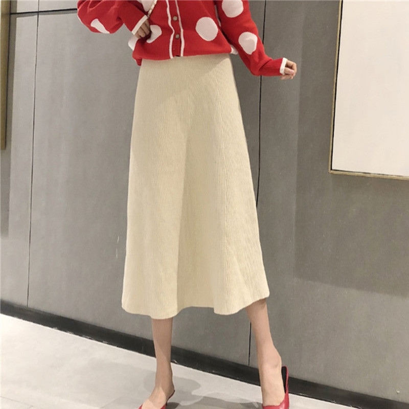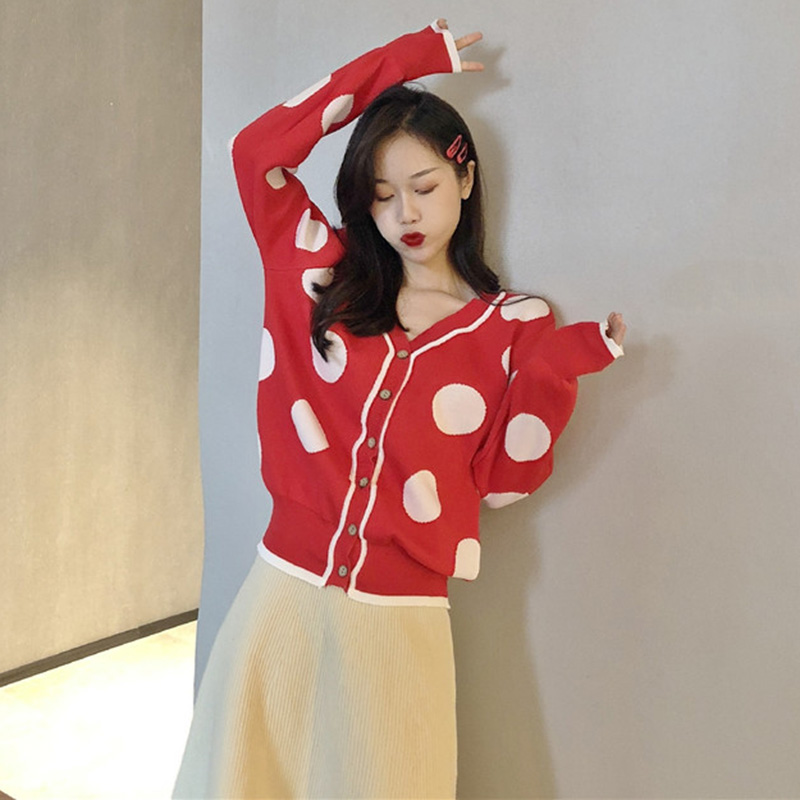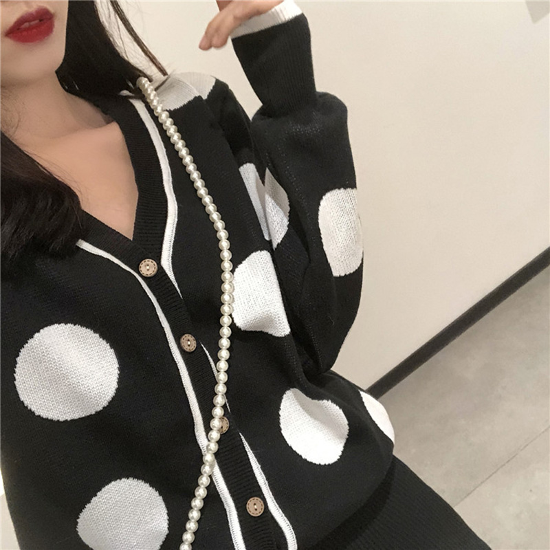 / 復古套裝女秋冬新款時尚波點V領毛衣外套中長款高腰針織半身裙子
