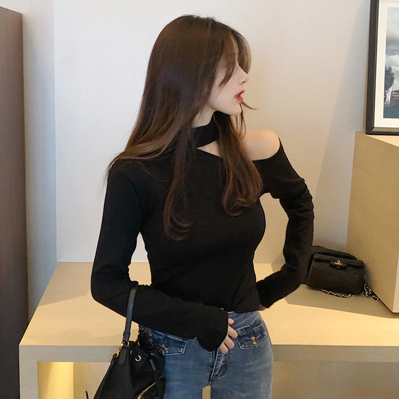 復古秋裝新款上衣女裝韓版修身顯瘦氣質chic露肩長袖打底針織衫潮