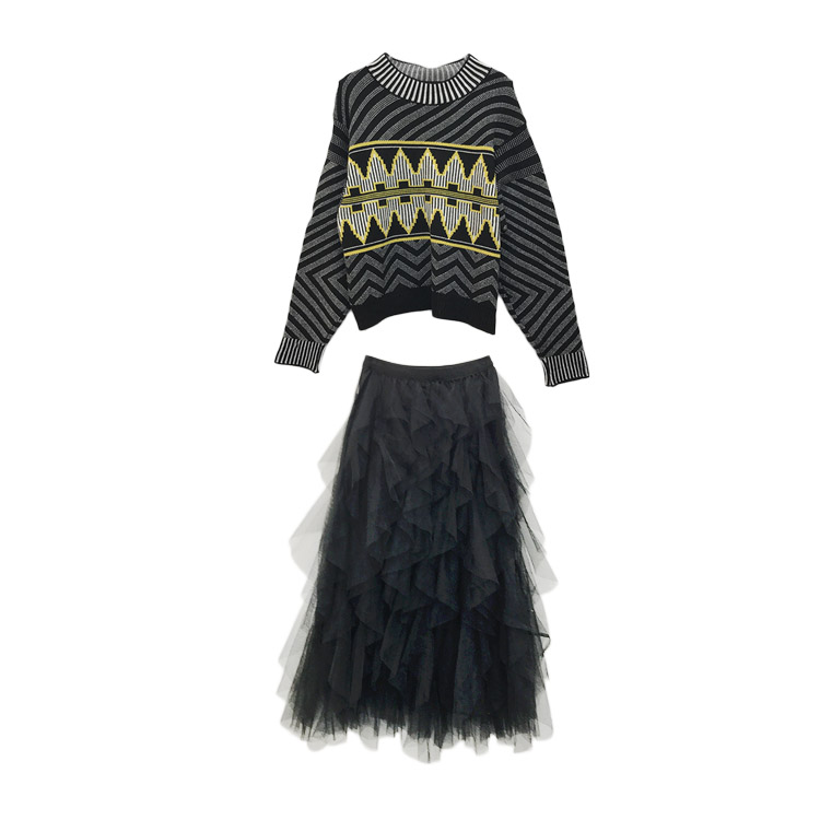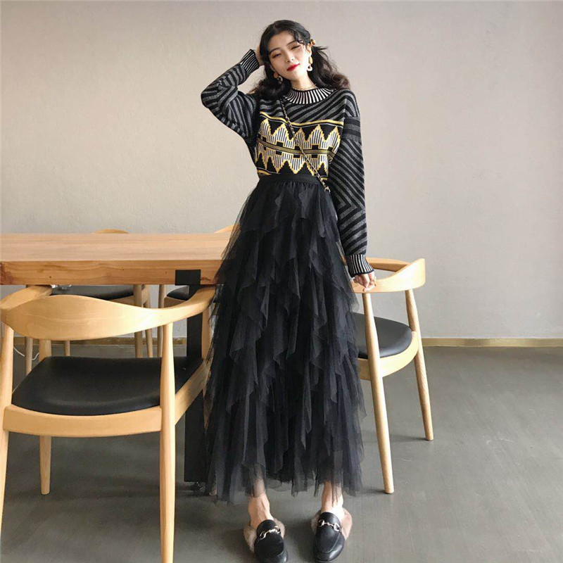 / 女神套裝秋冬新款幾何圖案毛衣+層層網紗半身裙仙女裙時尚兩件套