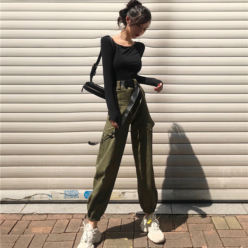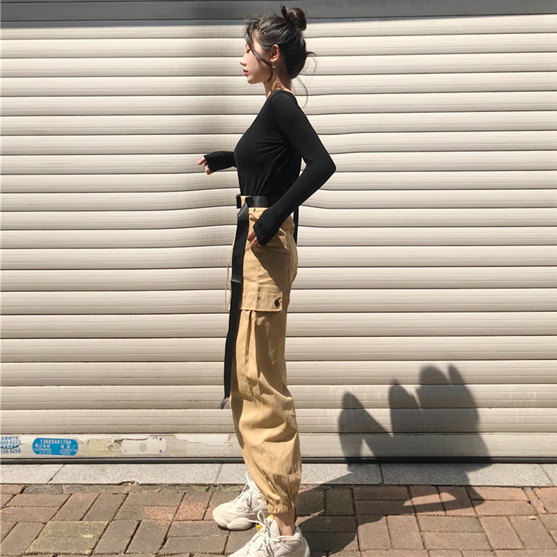 / 2018早秋新款兩件套裝港味長袖修身打底衫T恤+高腰工裝休閑哈倫褲