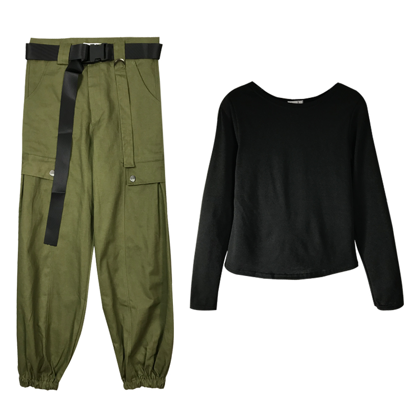 2018早秋新款兩件套裝港味長袖修身打底衫T恤+高腰工裝休閑哈倫褲