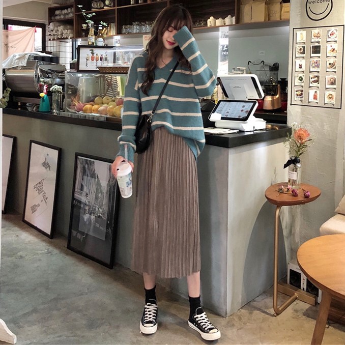 韓版時尚休閑套裝秋季女裝V領條紋針織毛衣外套+百褶半身裙兩件套