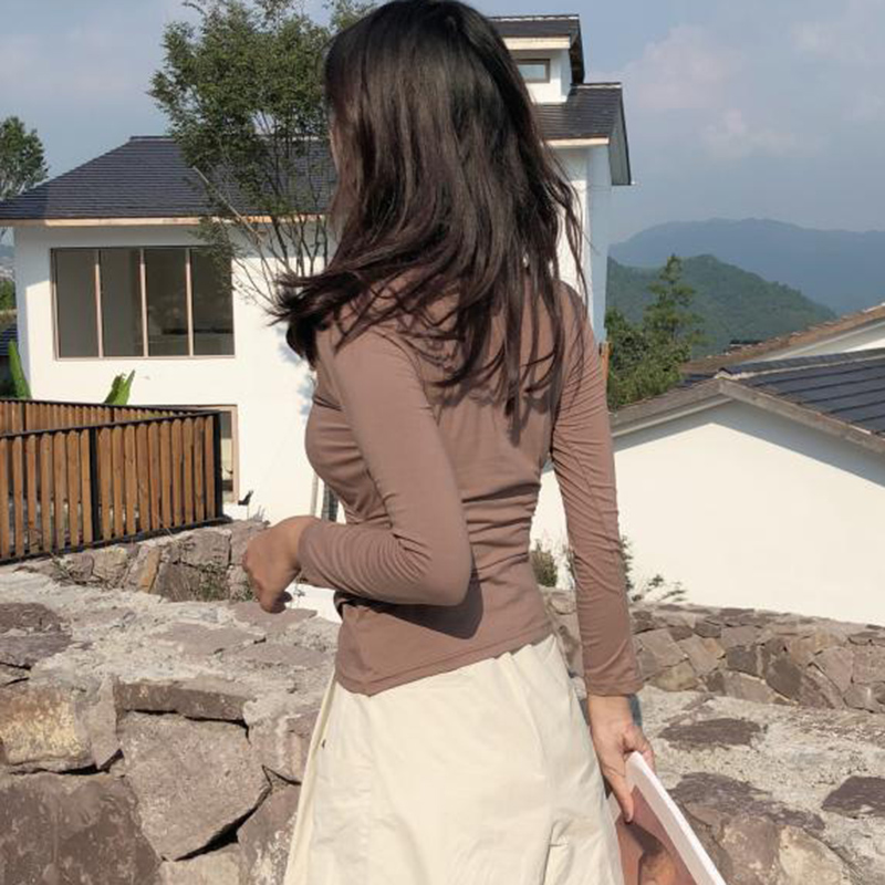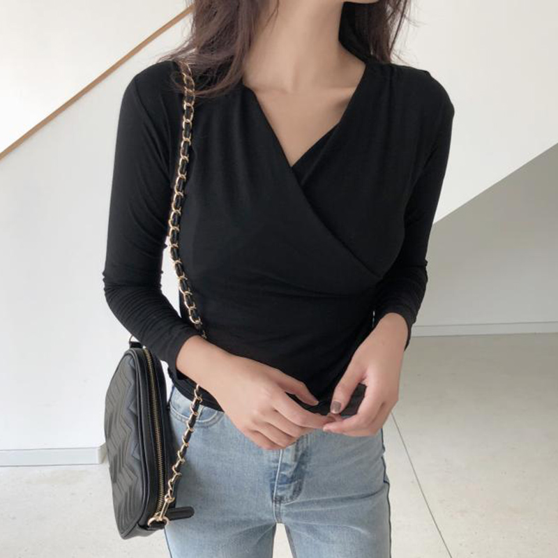 / 長袖打底衫早秋新款女裝復古氣質V領緊身上衣時尚百搭黑色顯瘦T恤