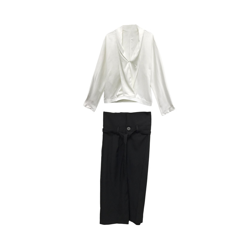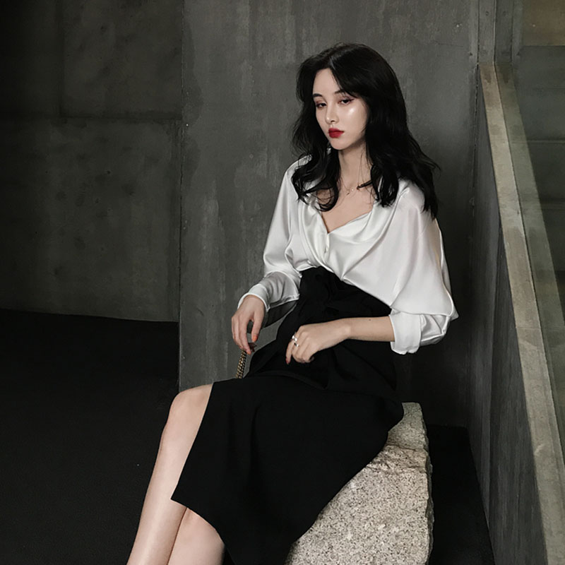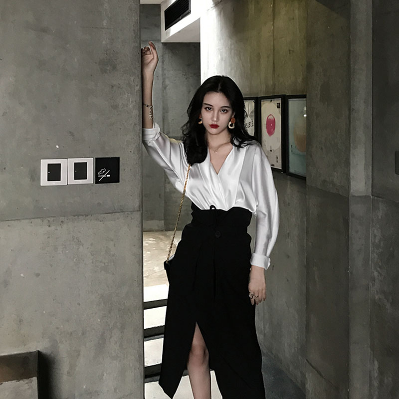 / 光澤感性感大v領襯衣女+復古OL風中長款花苞式高腰開叉半裙兩件套
