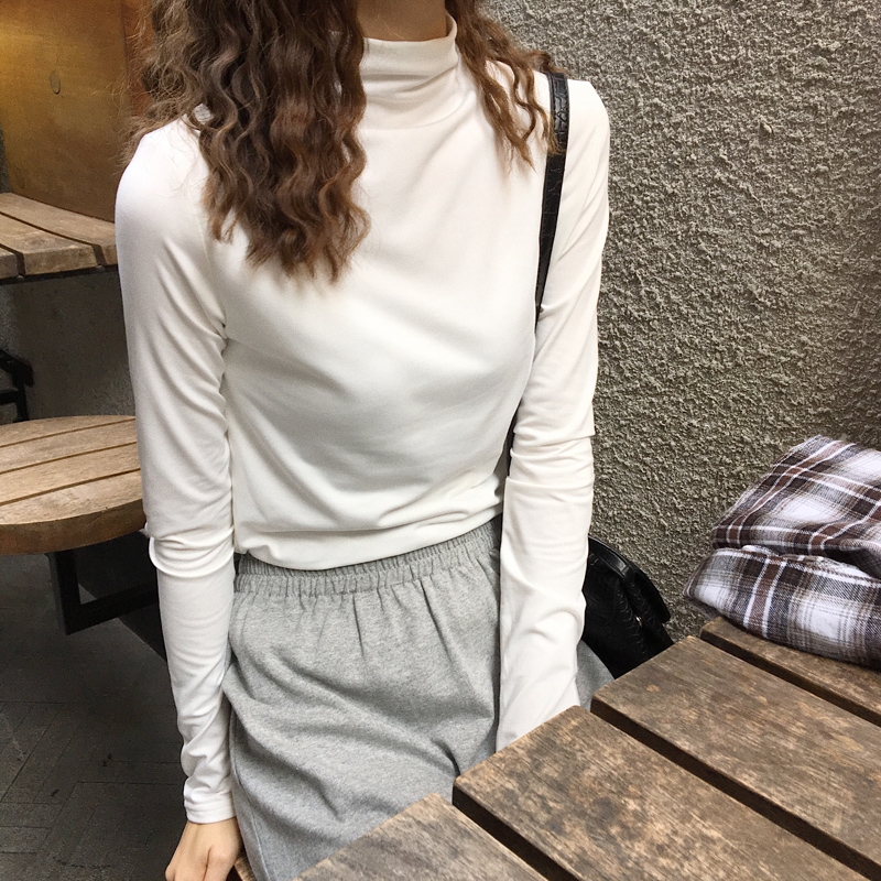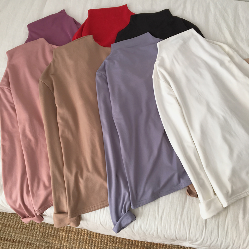 早秋上衣慵懶長袖t袖女內里磨毛棉修身顯瘦半高領純色套頭打底衫