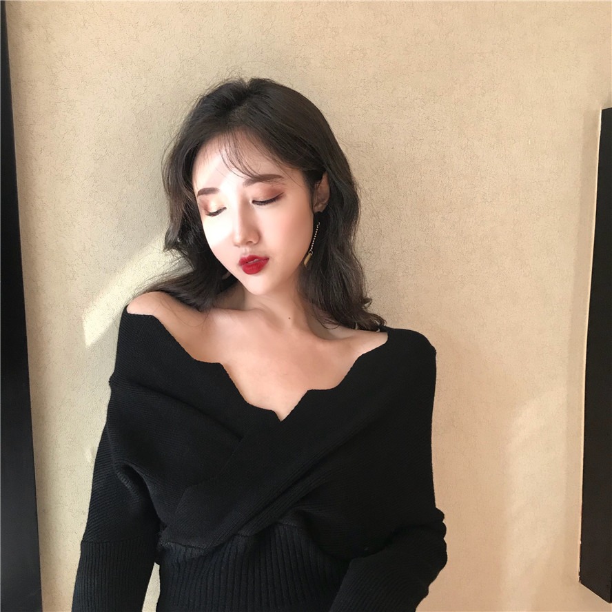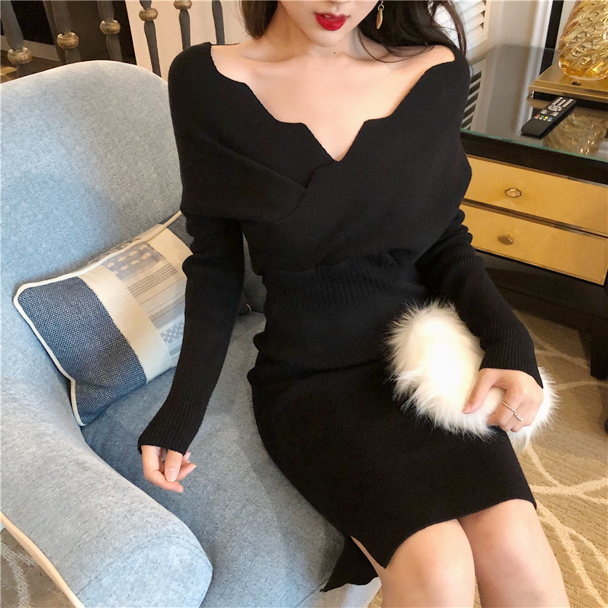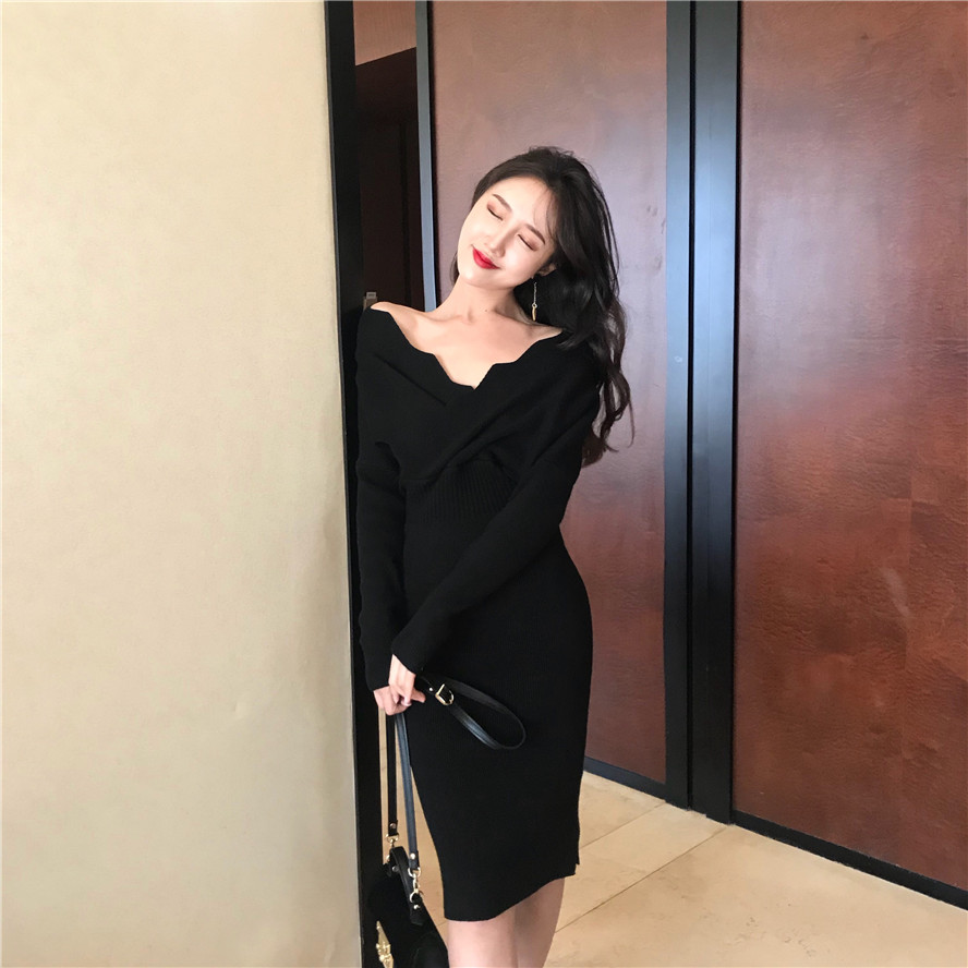 / 秋冬新款韓版氣質網紅黑色連衣裙長袖露肩修身針織中長款包臀裙子