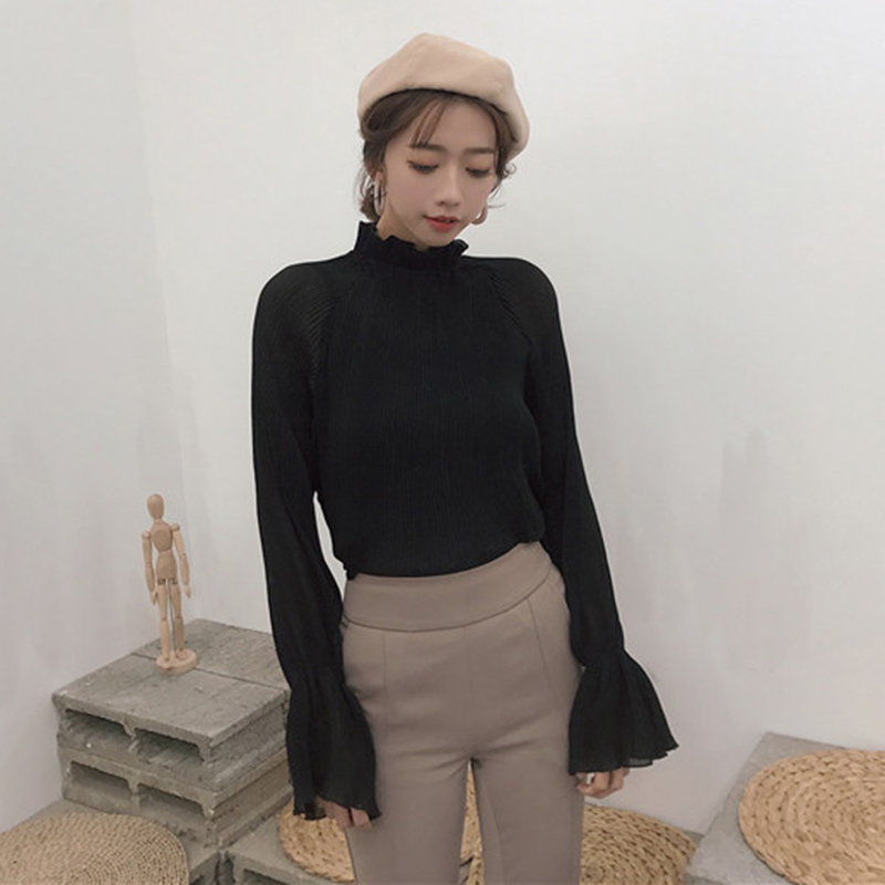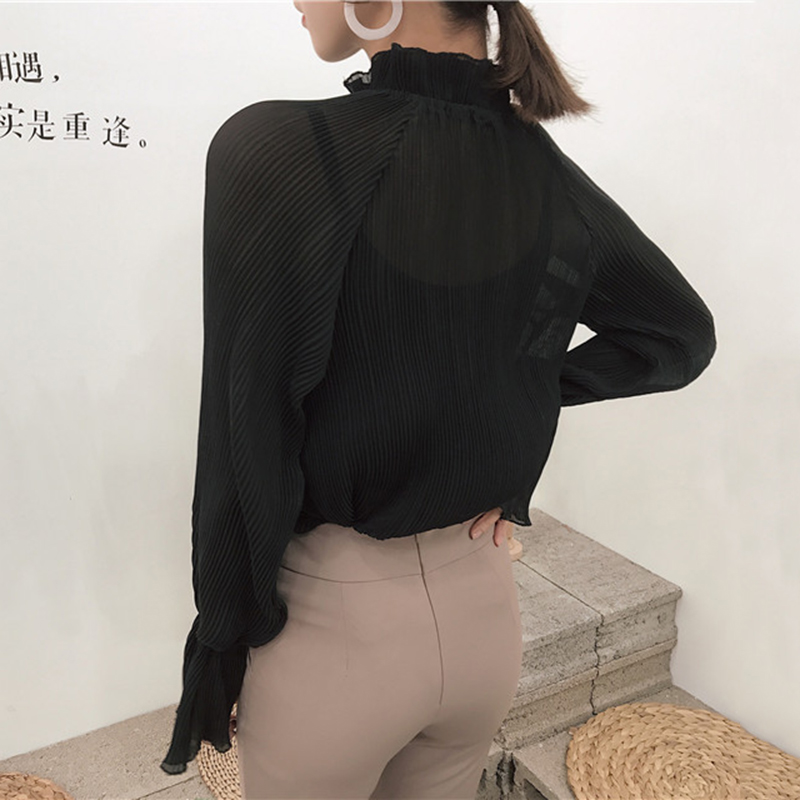 / 氣質雪紡衫女秋裝新款花邊領百褶網紗立領上衣花瓣袖內搭打底襯衫
