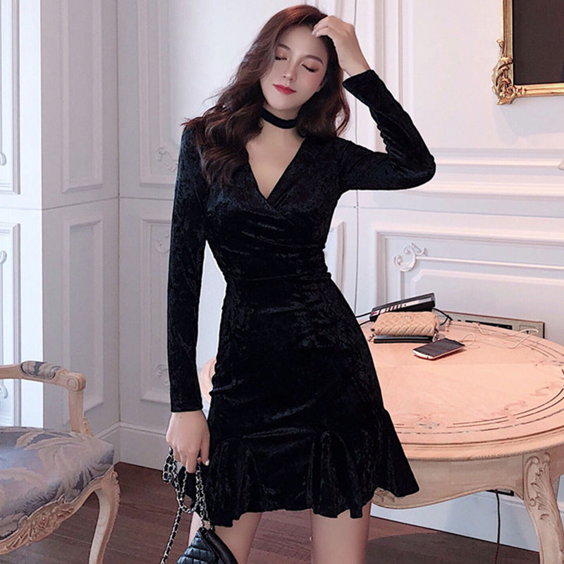 修身顯瘦絲絨連衣短裙子秋冬裝新款復古法式少女egg荷葉邊桔梗裙