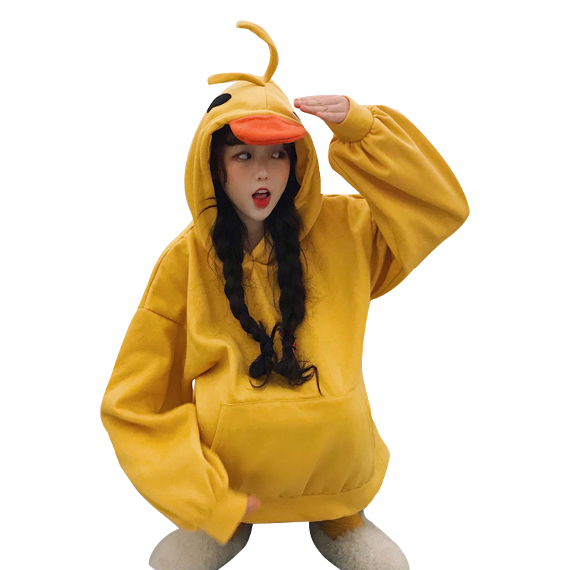 2018新款秋冬韓版純色寬松加絨加厚小黃鴨連帽套頭衛衣上衣外套女
