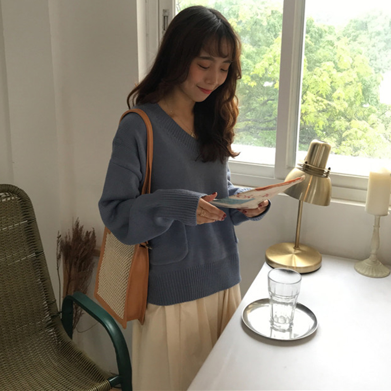 秋裝女2018新款韓版寬松V領套頭毛衣學生顯瘦純色長袖針織上衣潮