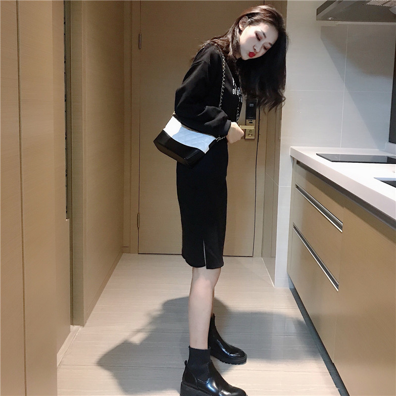 秋冬時尚女裝新款chic簡約百搭字母印花收腰修身顯瘦中長款連衣裙