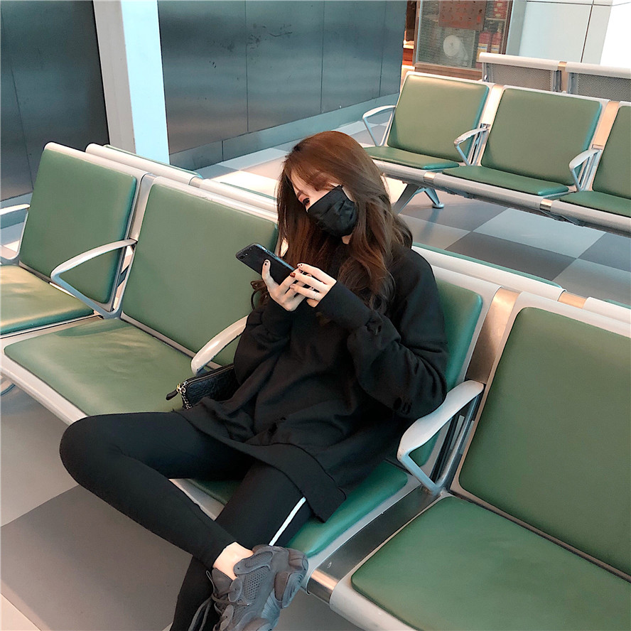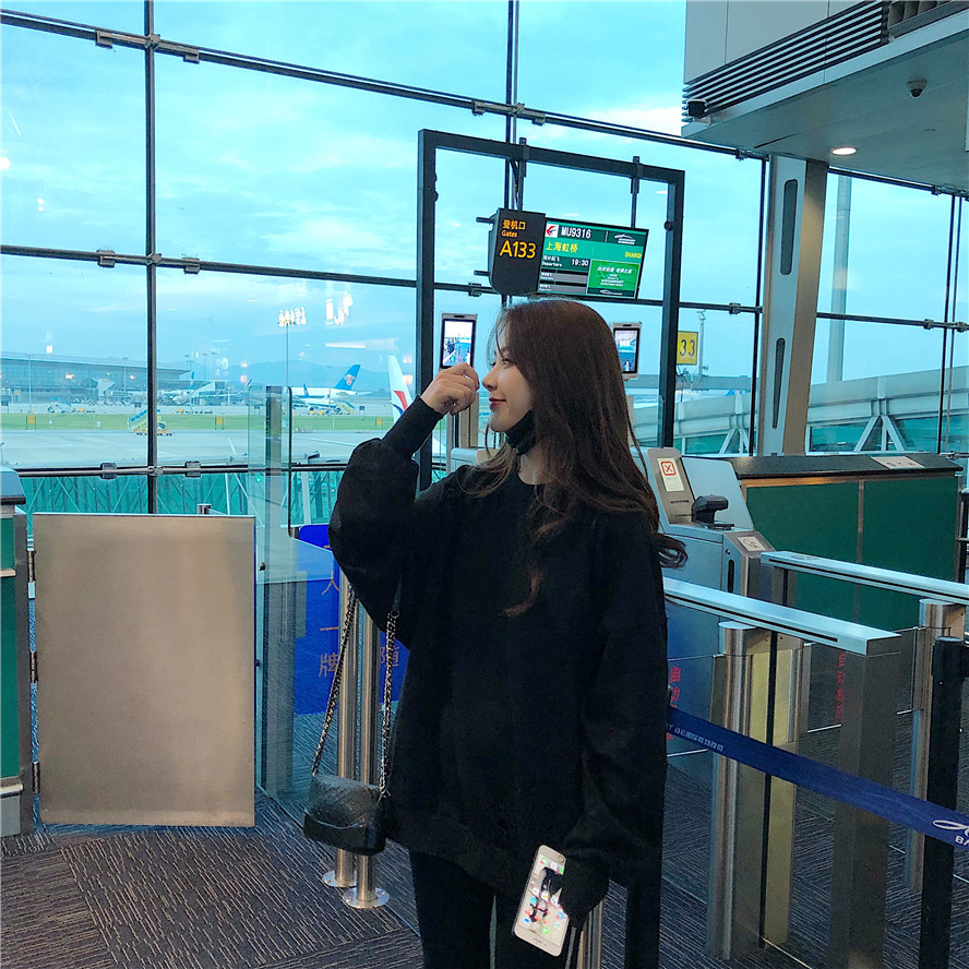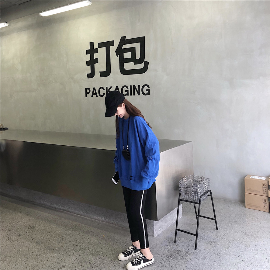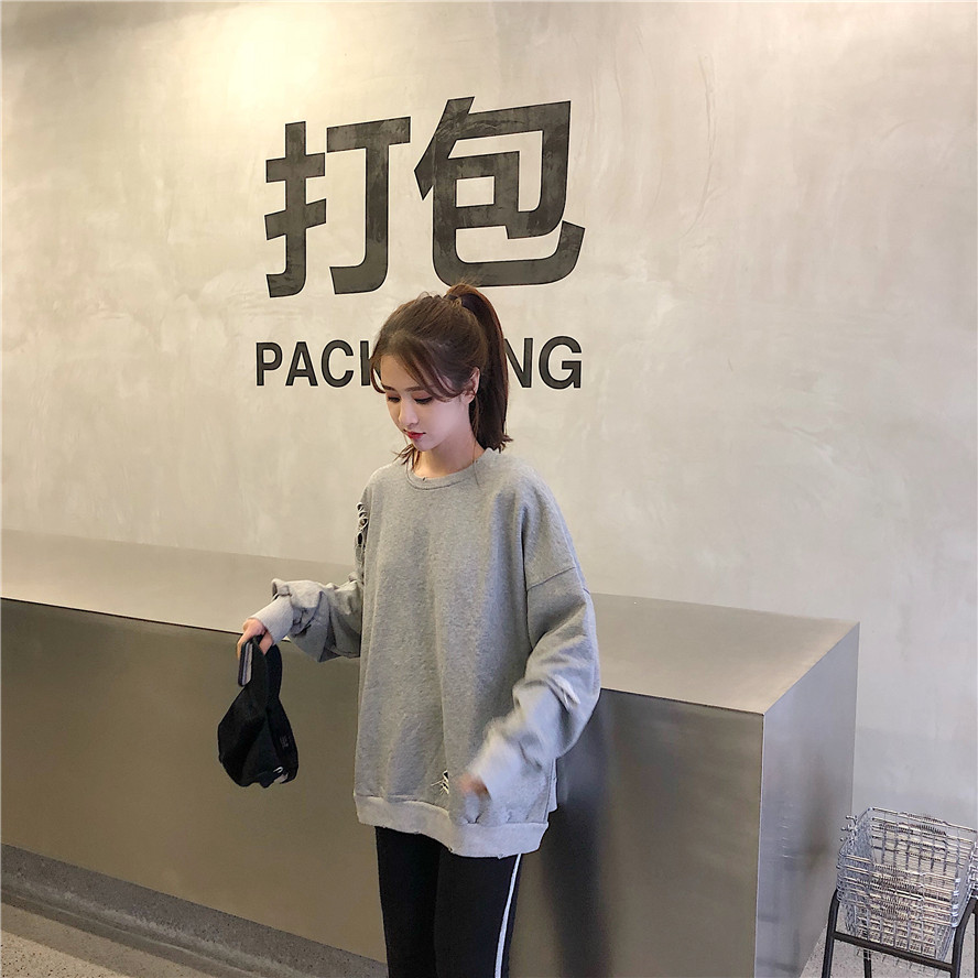 / 2018新款破洞慵懶風時尚設計感百搭中長款純色衛衣加絨寬松上衣女
