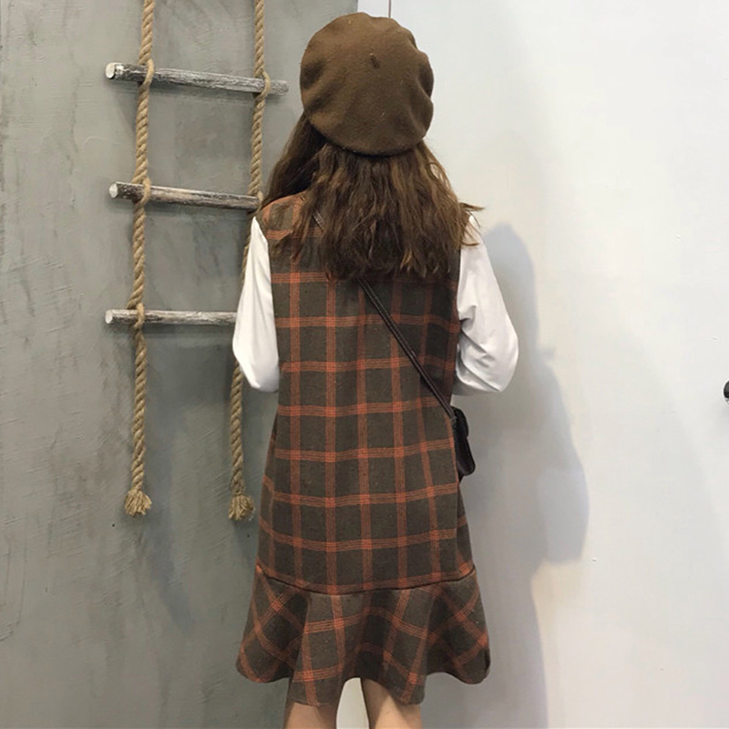 / 學院風中長裙秋裝女新款韓版學生蝴蝶結格子連衣裙假兩件荷葉裙子
