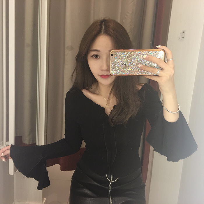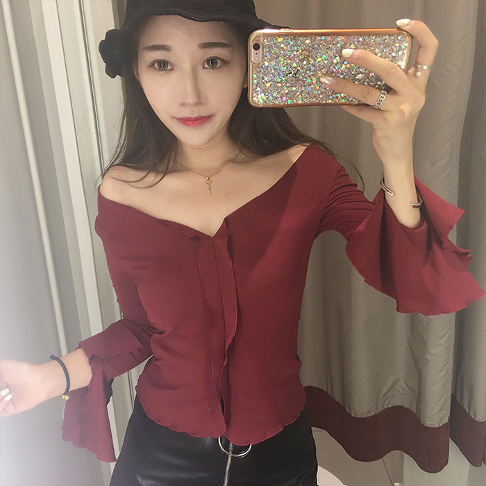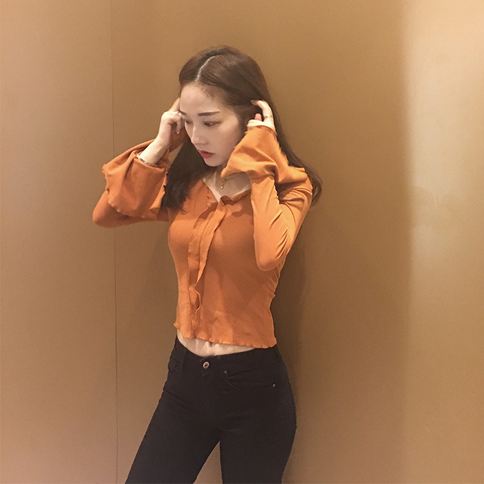 / 黃色喇叭袖打底衫v領修身上衣女秋2018新款女裝白色荷葉領長袖t恤