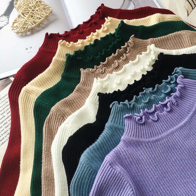 / 秋冬女裝韓版木耳邊半高領純色修身顯瘦毛衣打底衫長袖針織衫上衣