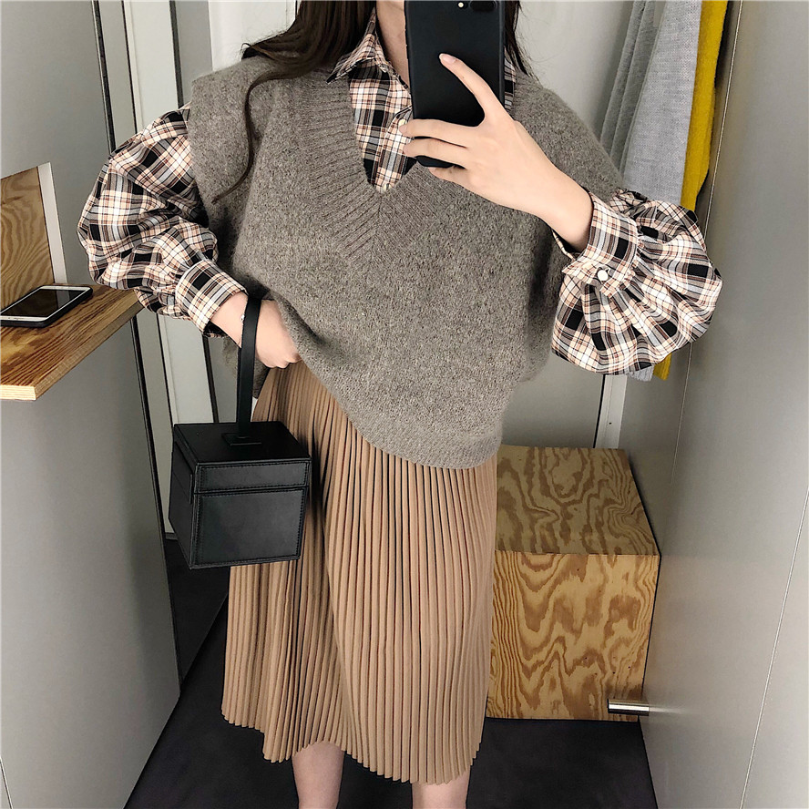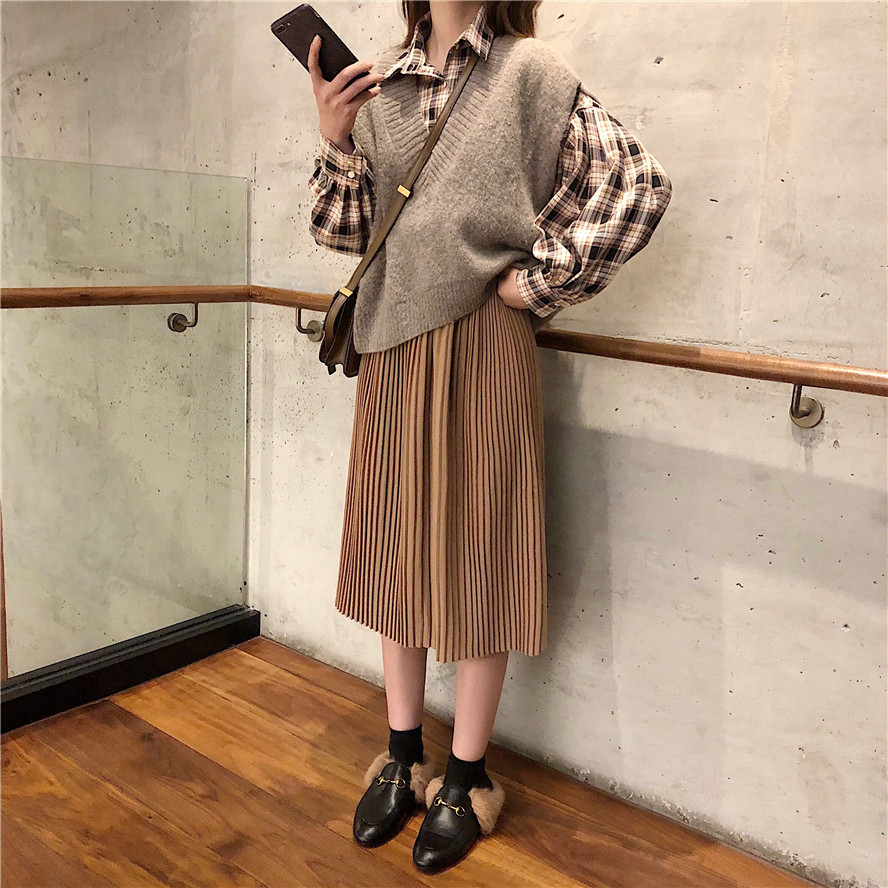 / 韓版時尚秋裝女2018新款套裝百搭格子襯衣+針織馬甲+百褶裙三件套