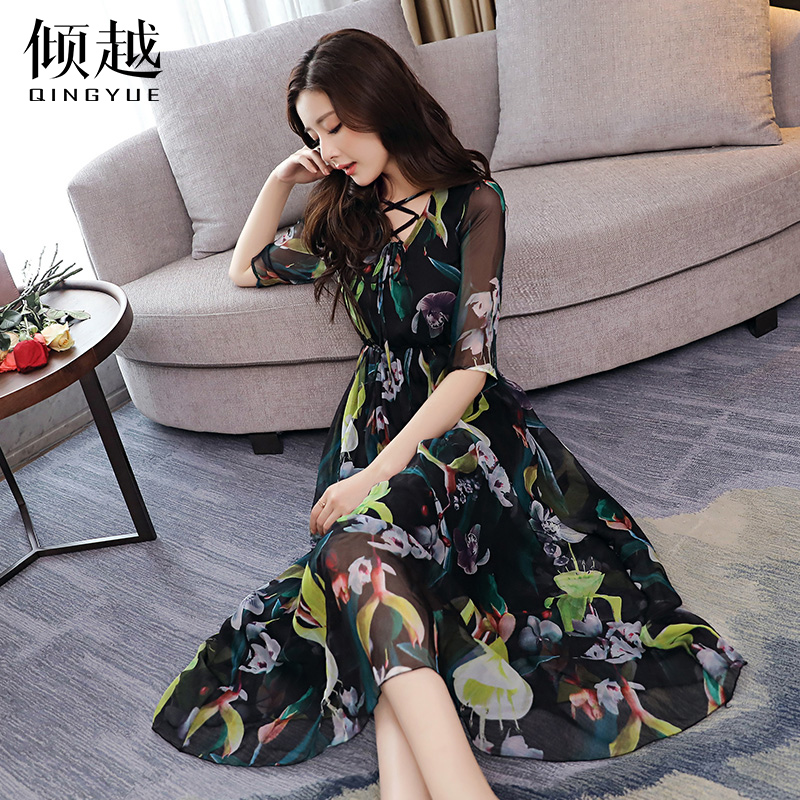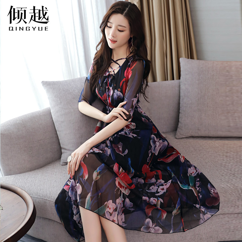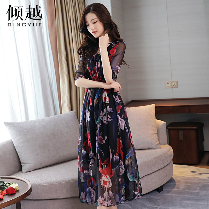 / 傾越2017夏季新款套頭短袖雪紡連衣裙女中長款修身顯瘦度假長裙潮