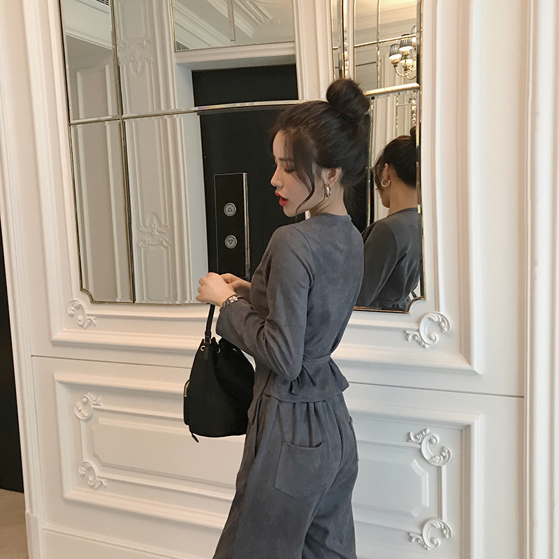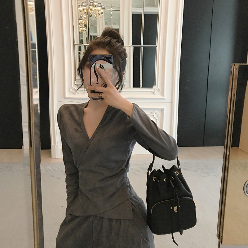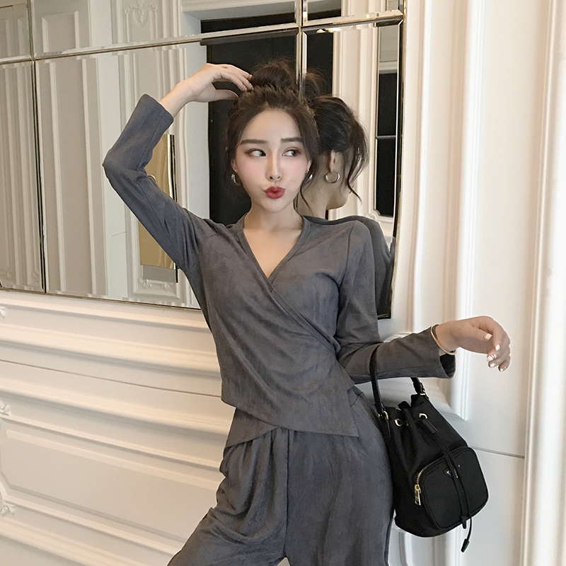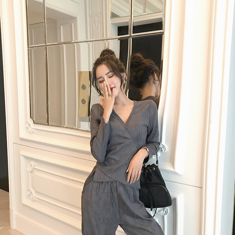 2018韓版新款氣質夜店女裝性感深V領長袖上衣修身長褲時尚套裝潮