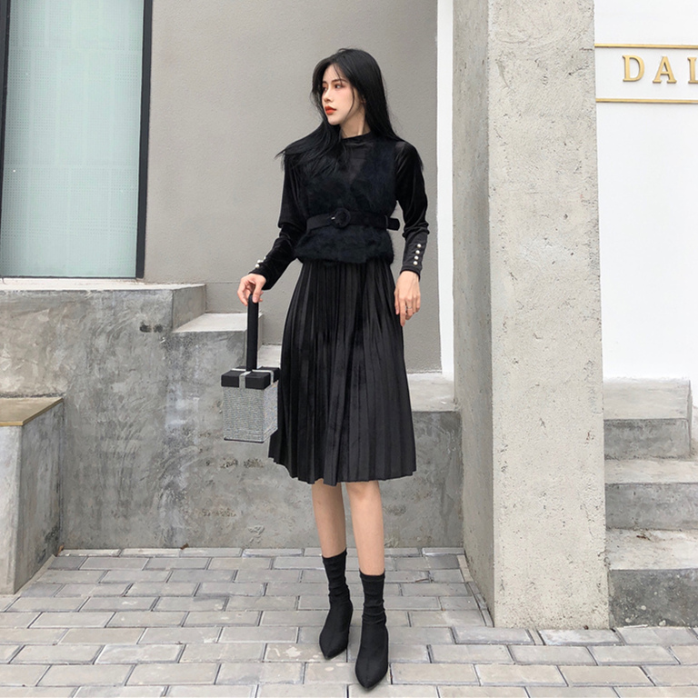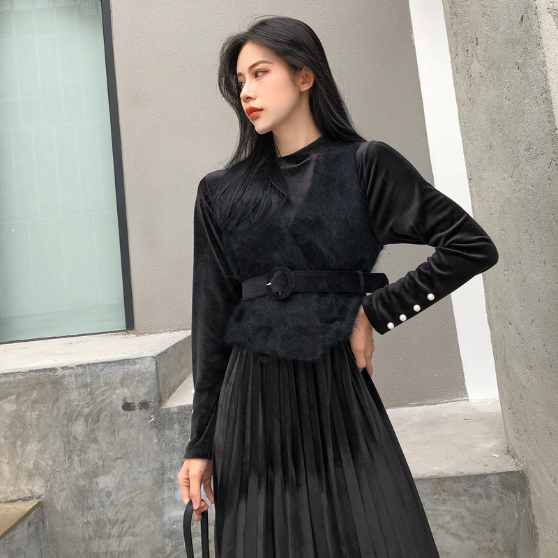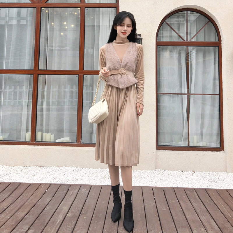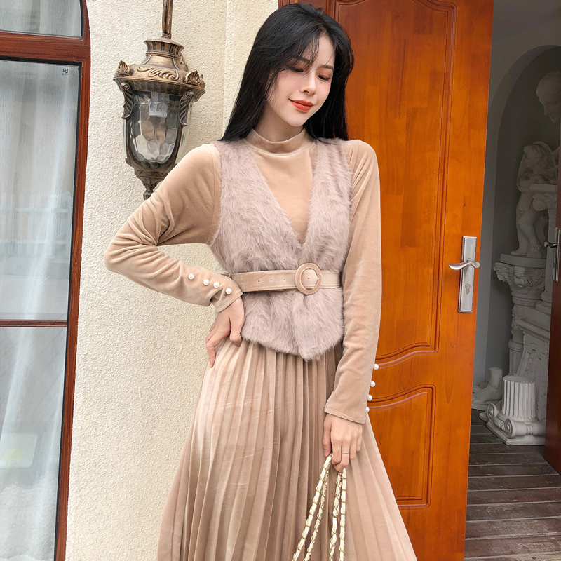 女神套裝秋冬新款網紗背心裙+毛毛高領側面開叉連衣裙外套兩件套