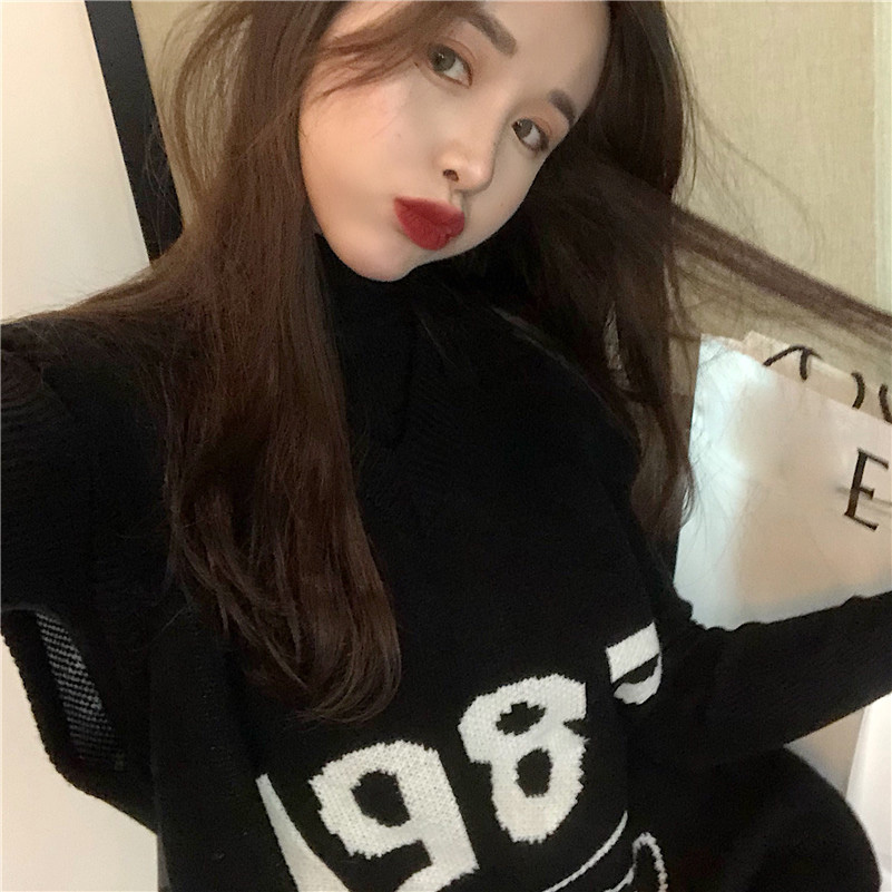 寬松懶惰風毛衣字母v領上衣菱格子高腰半身裙復古chic時尚套裝女