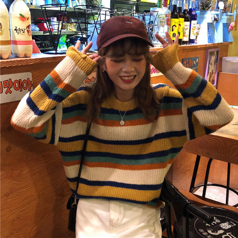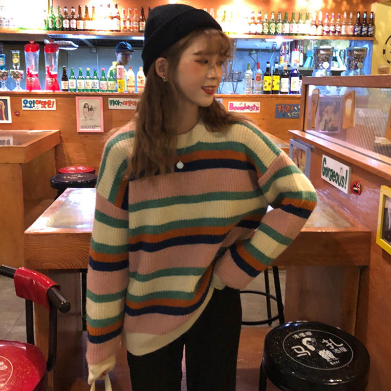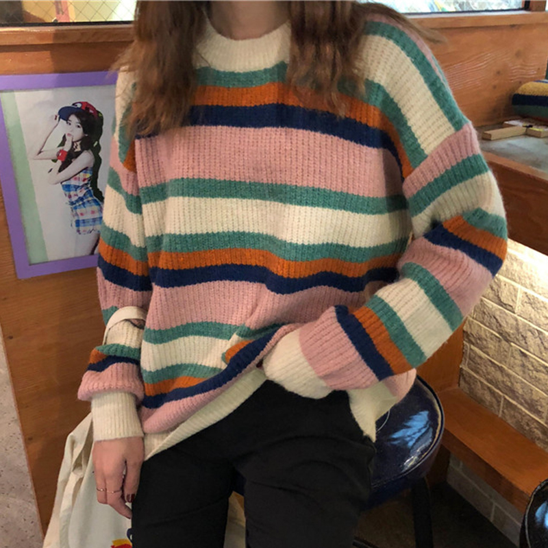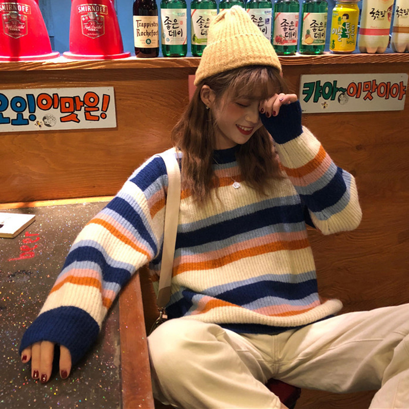 時尚拼色條紋毛衣女秋冬裝2018新款圓領針織外套學生寬松慵懶上衣