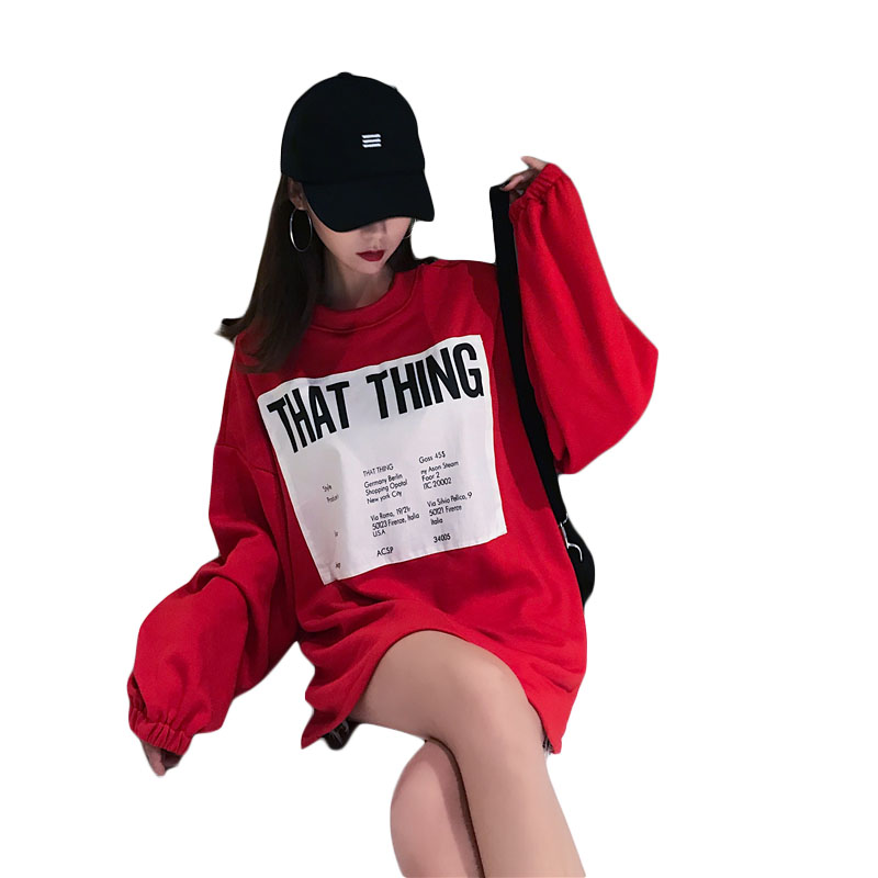 衛衣2018新款女長袖韓版寬松顯瘦oversize印花半高領慵懶長款裙子