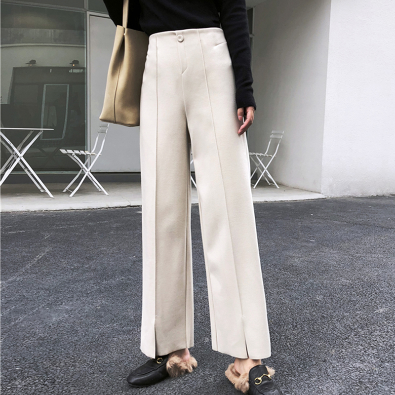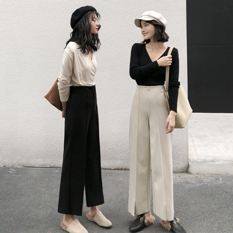 秋冬女裝2018新款復古風高腰顯瘦開叉休閑褲黑色寬松闊腿九分褲子