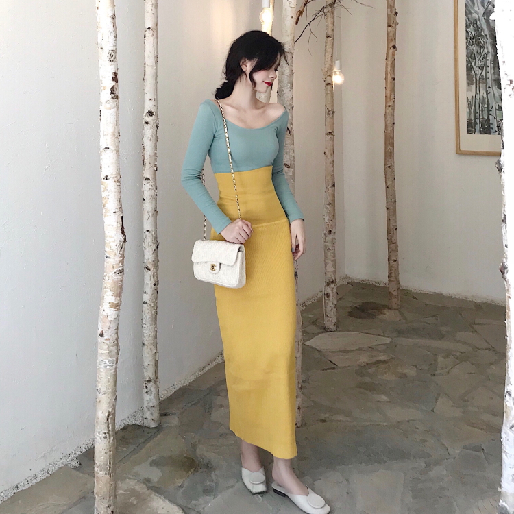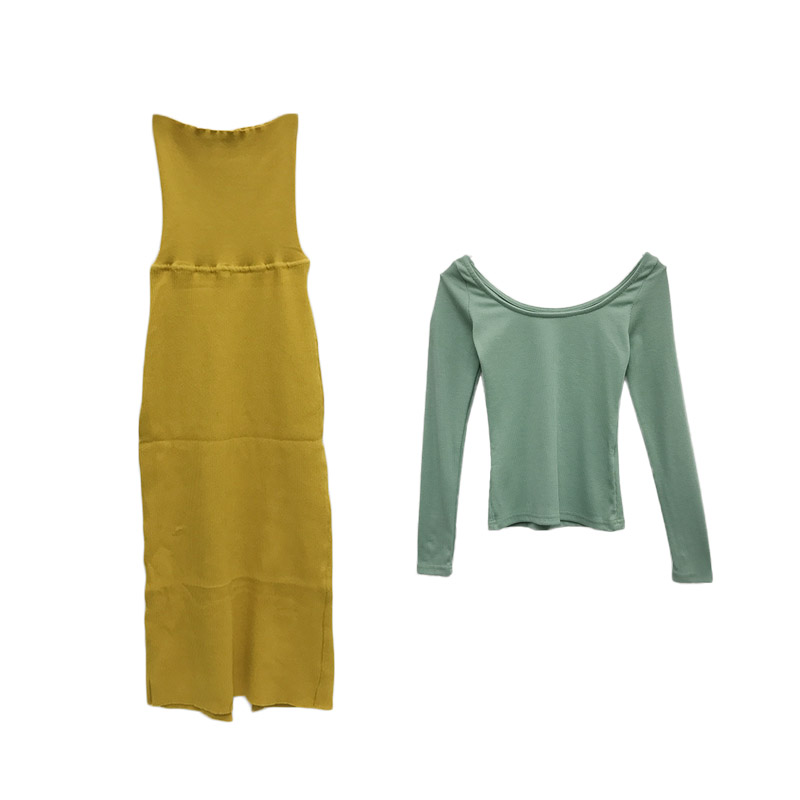 豆沙綠圓領長袖螺紋長袖T恤打底衫+復古包臀抹胸連衣裙套裝兩件套