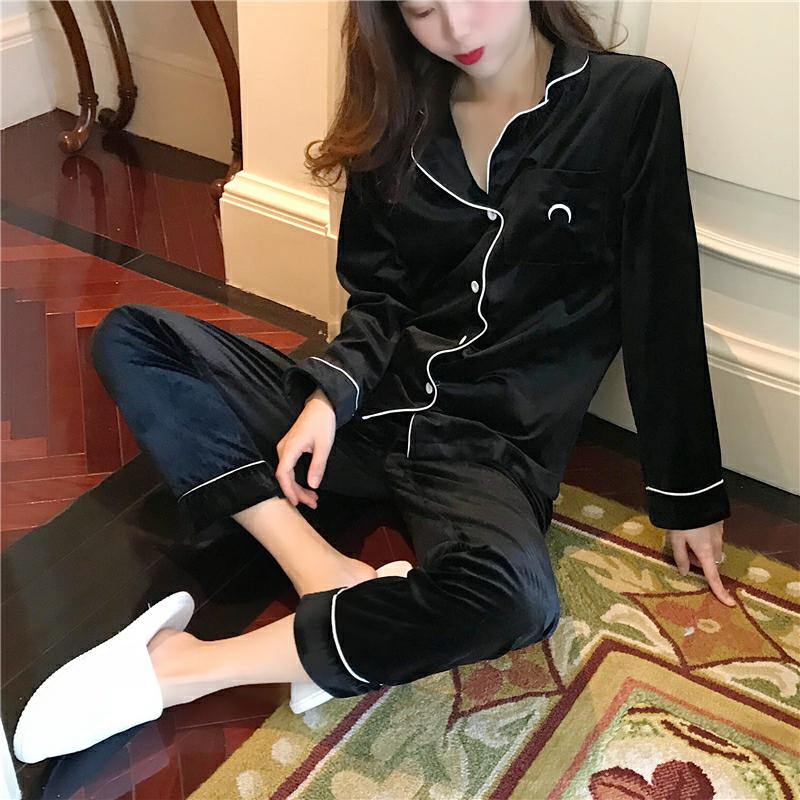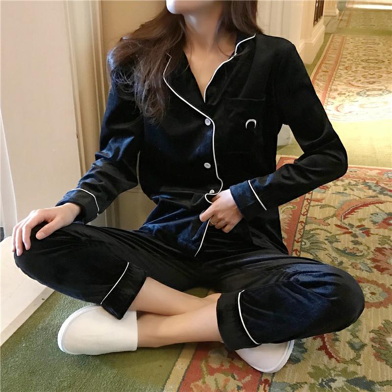 / 2018復古新款秋季韓版長袖絲絨月亮刺繡舒適長褲睡衣家居服套裝女