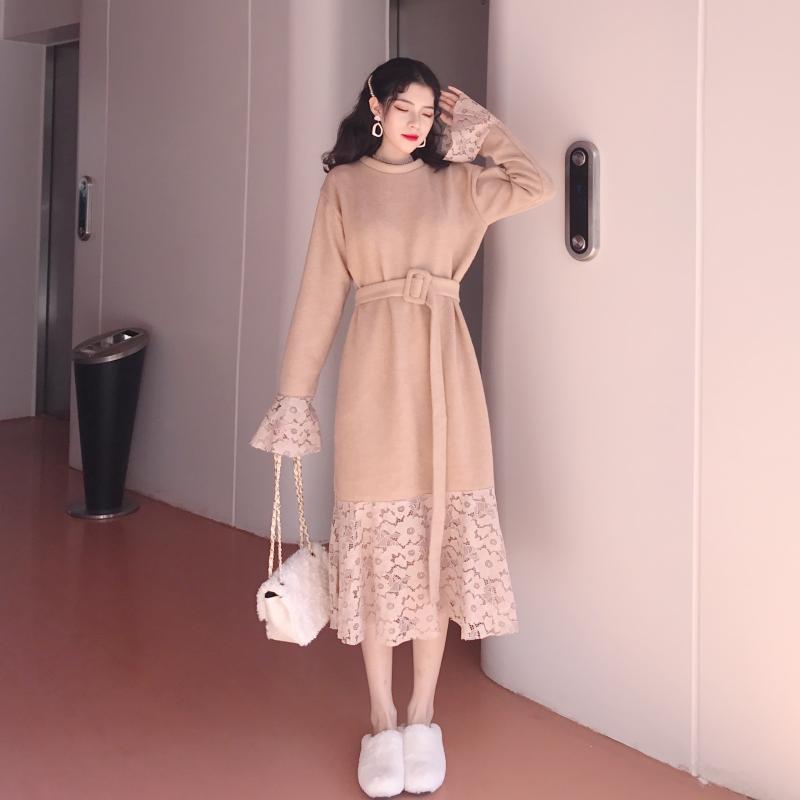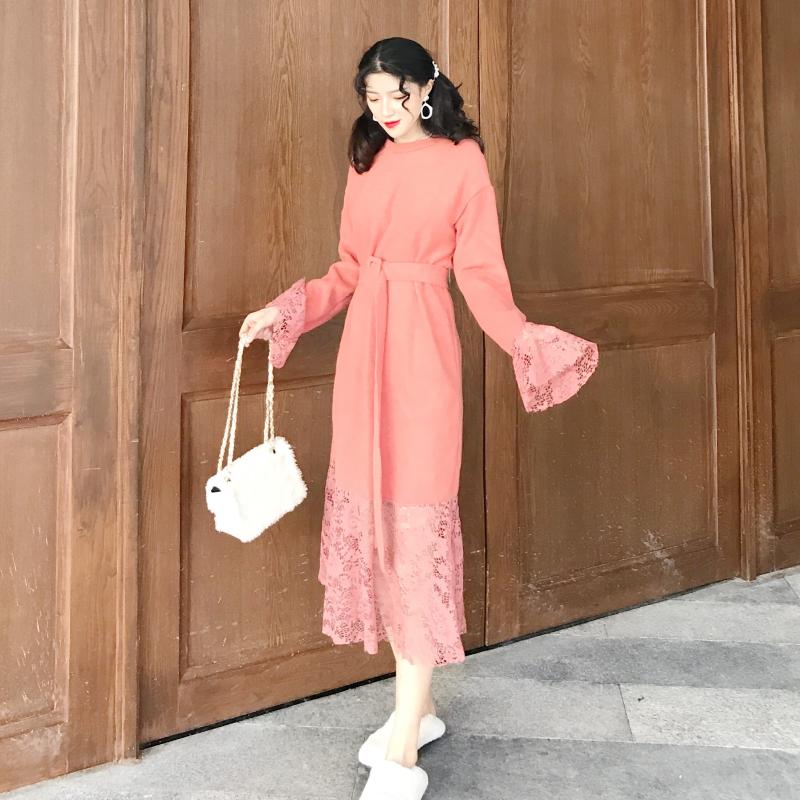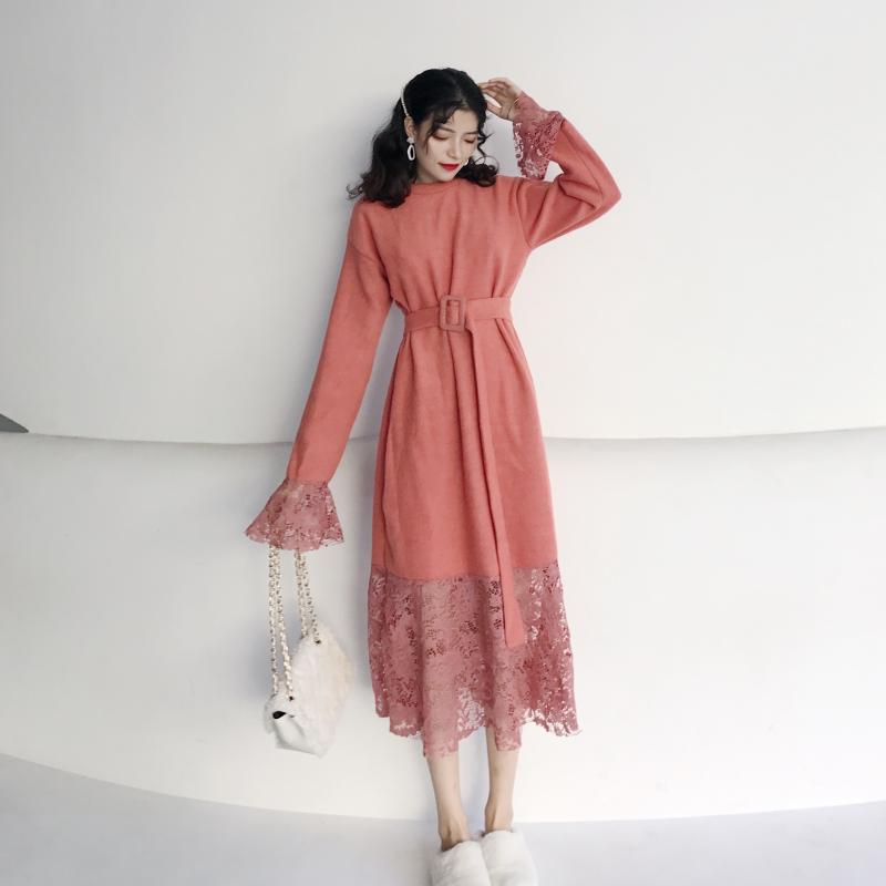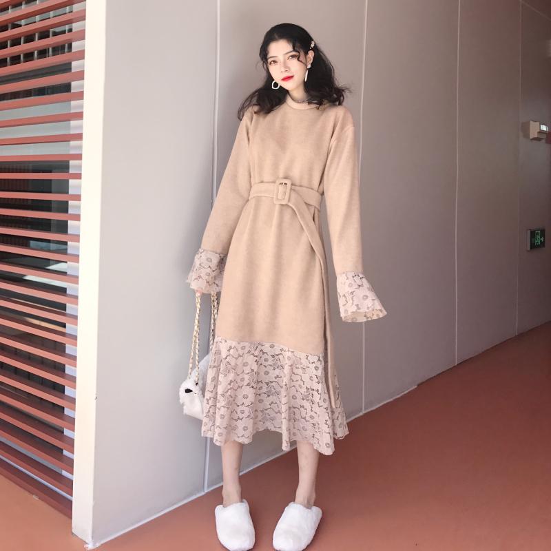 / 港味裙子女秋冬2018新款氣質磨毛加厚拼接蕾絲帶腰帶連衣裙女長裙