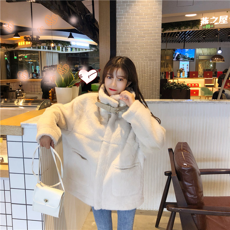 韓版新款秋冬時尚百搭長袖復古寬松高領中長款毛絨加厚保暖外套女