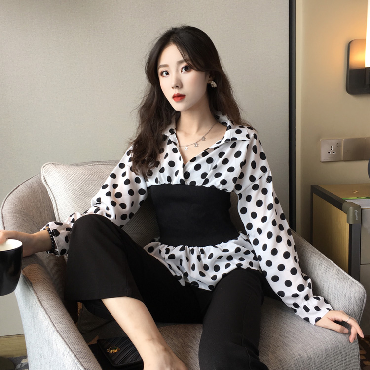 網紅chic慵懶風襯衣女2018新款波點襯衫女收腰雪紡顯瘦設計感上衣