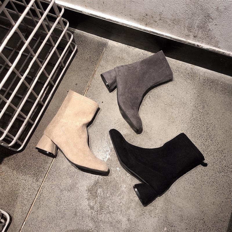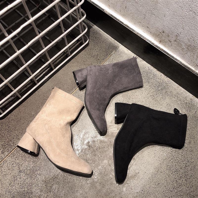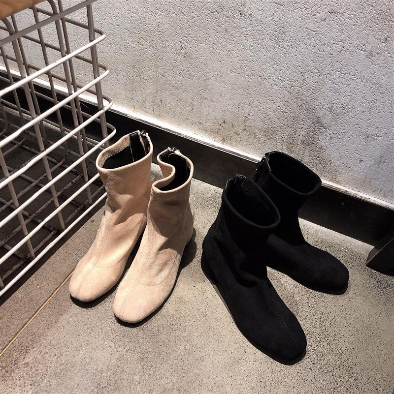 韓版簡約中跟韓國chic方頭后尖頭拉鏈純色粗跟短靴女春秋2018新款