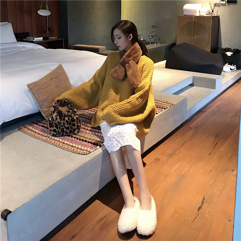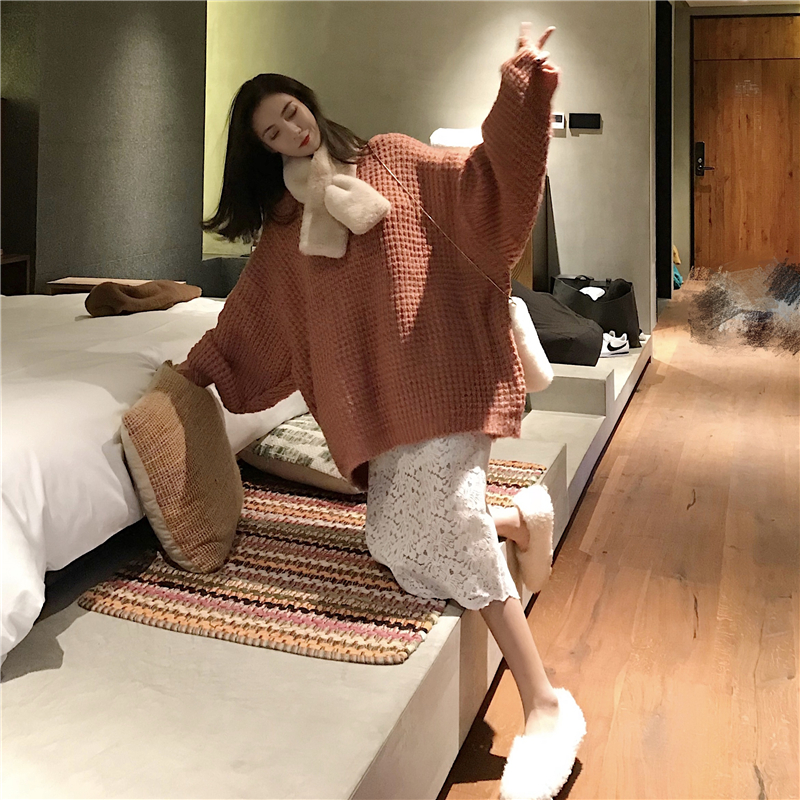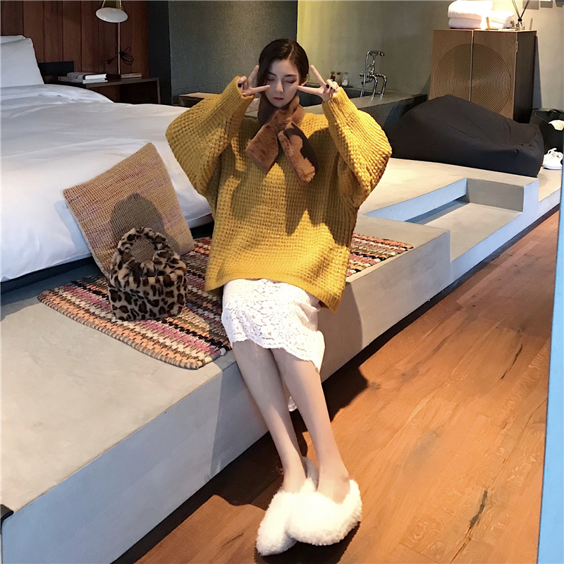 / 韓版寬松套頭厚實中長款毛衣女秋冬2018新款+蕾絲半身裙+圍脖套裝