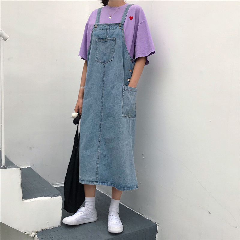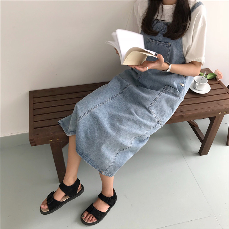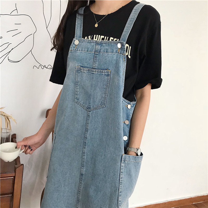 夏季新款女裝口袋紐扣水洗寬松顯瘦學生百搭中長背帶牛仔連衣裙女